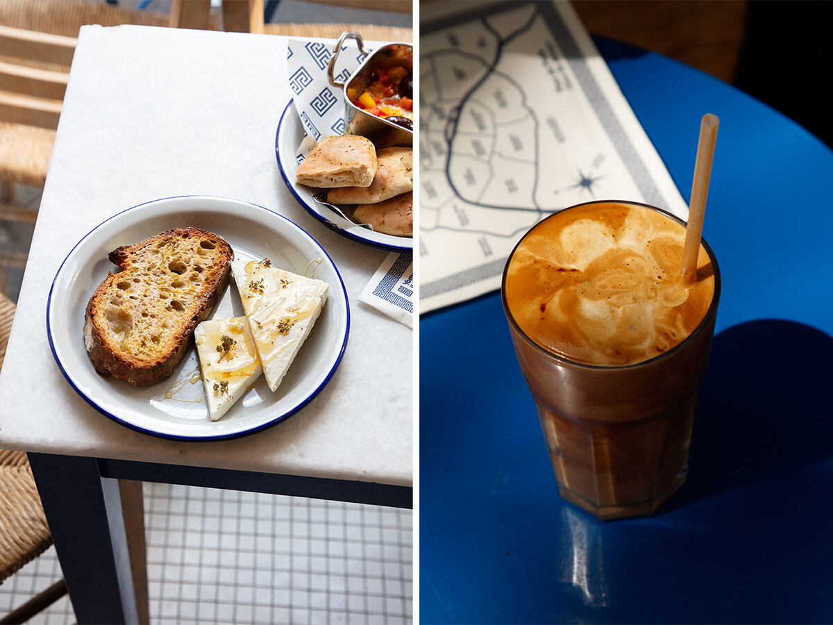 左: 田舎パンのトーストと蜂蜜をかけたフェタチーズ。12ユーロ。右: 一日中、人気の飲み物はミルクとシュガーたっぷりのフラッペだ。4ユーロ。photos: Emmanuelle Lubaki©️Yorgo&co