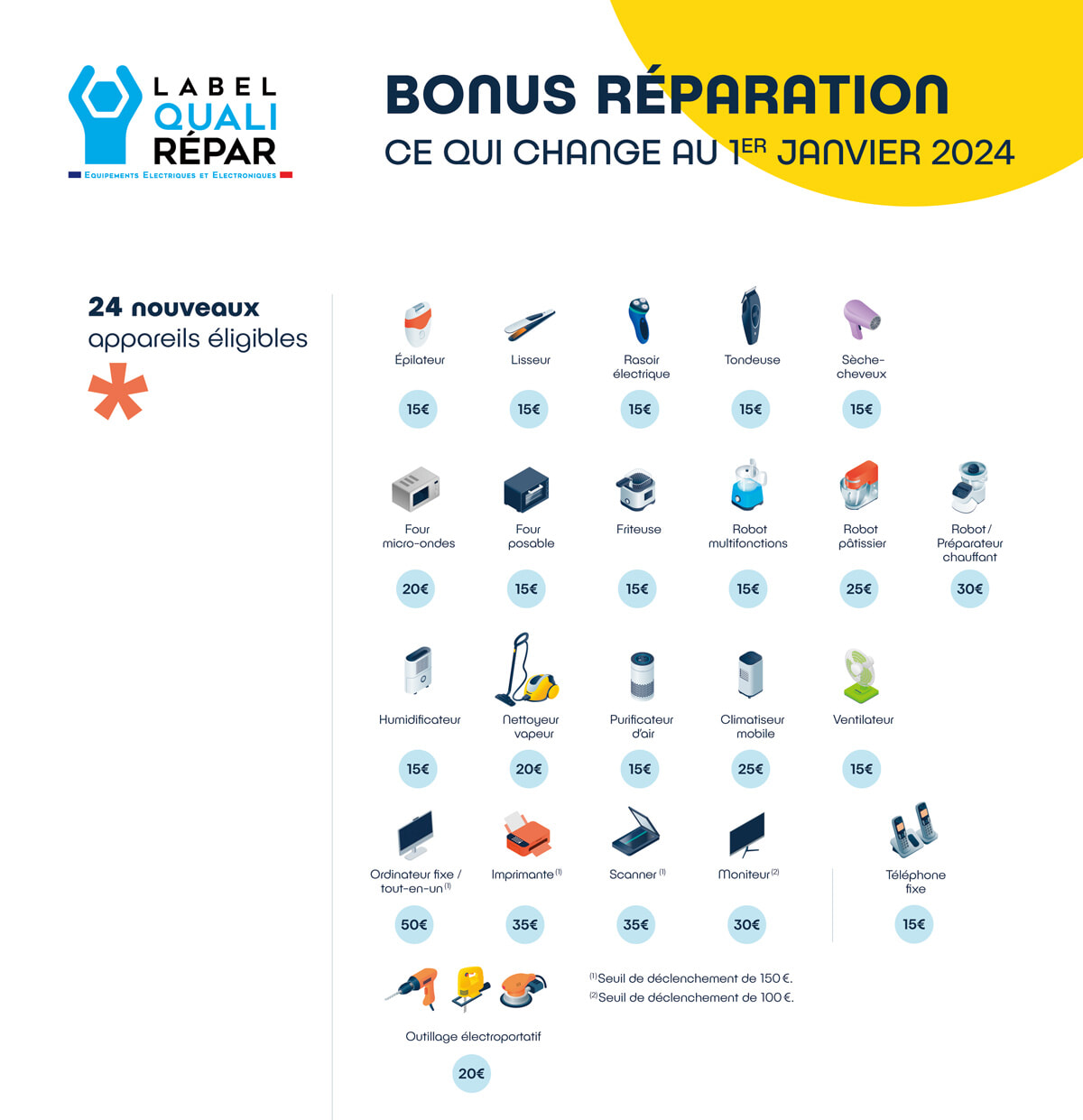 家電で今年1月からリペアボーナスの対象となった24品目。左上のラベルが認定業者の印。www.ecosystem.ecoより。