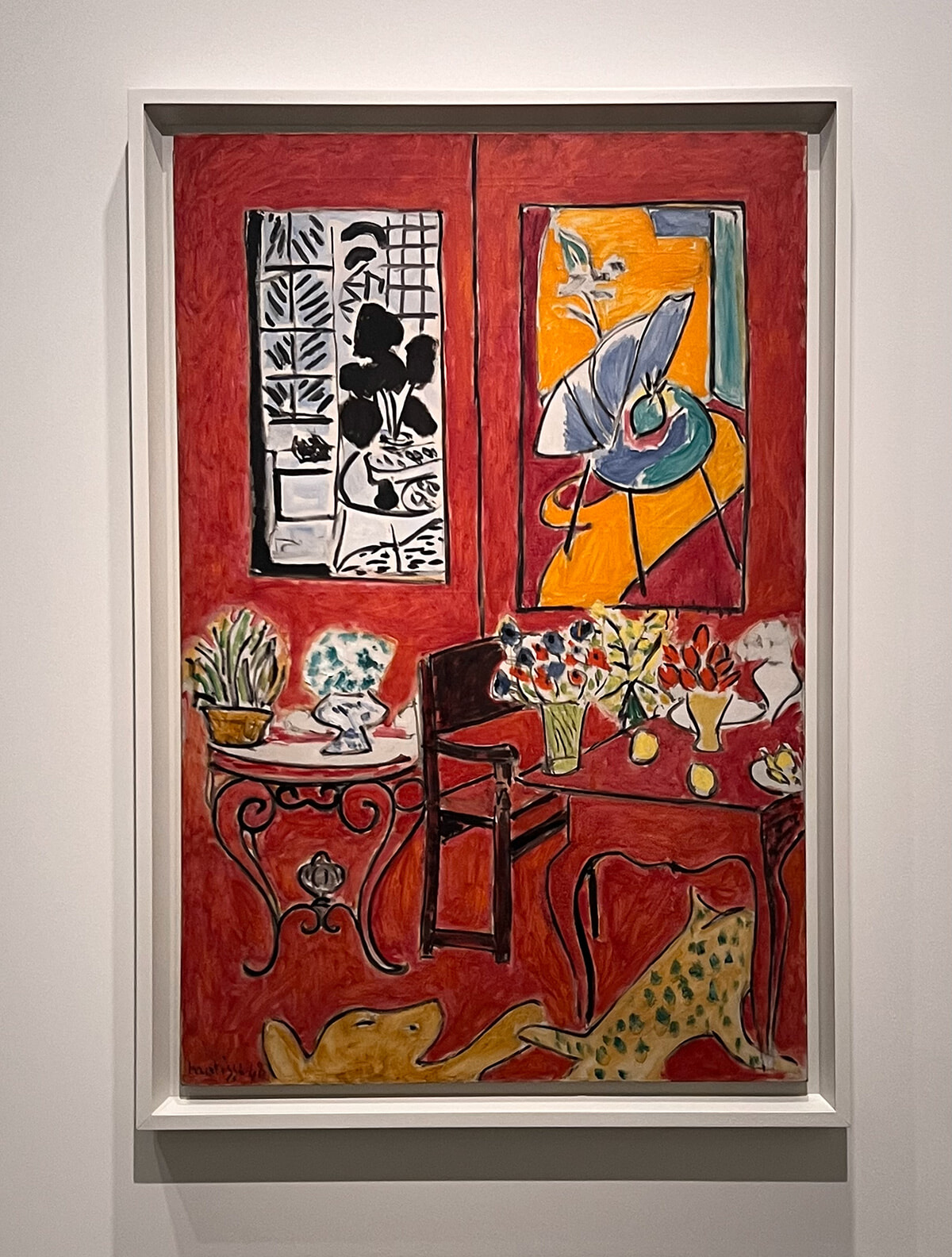 MoMAが入手し、一般に公開する間にマティスの息子ピエールはニューヨークにもつ自分の画廊で父の近作展を開催。その中の最大の作品は『Grand intérieur rouge(大きな赤い室内)』(1949年)でこれは色の強さから『赤いアトリエ』を想起させるが、それに比べると描かれているオブジェ類のリアリティが保たれている。この作品は1949年にパリに戻り、近代美術館で開催されたマティス回顧展にて展示された。ちなみに『赤のアトリエ』が最後にパリで展示されたのは、ポンピドゥー・センターで1993年に開催された回顧展において。つまり今回、31年ぶりにパリでこの作品を鑑賞できるのである。