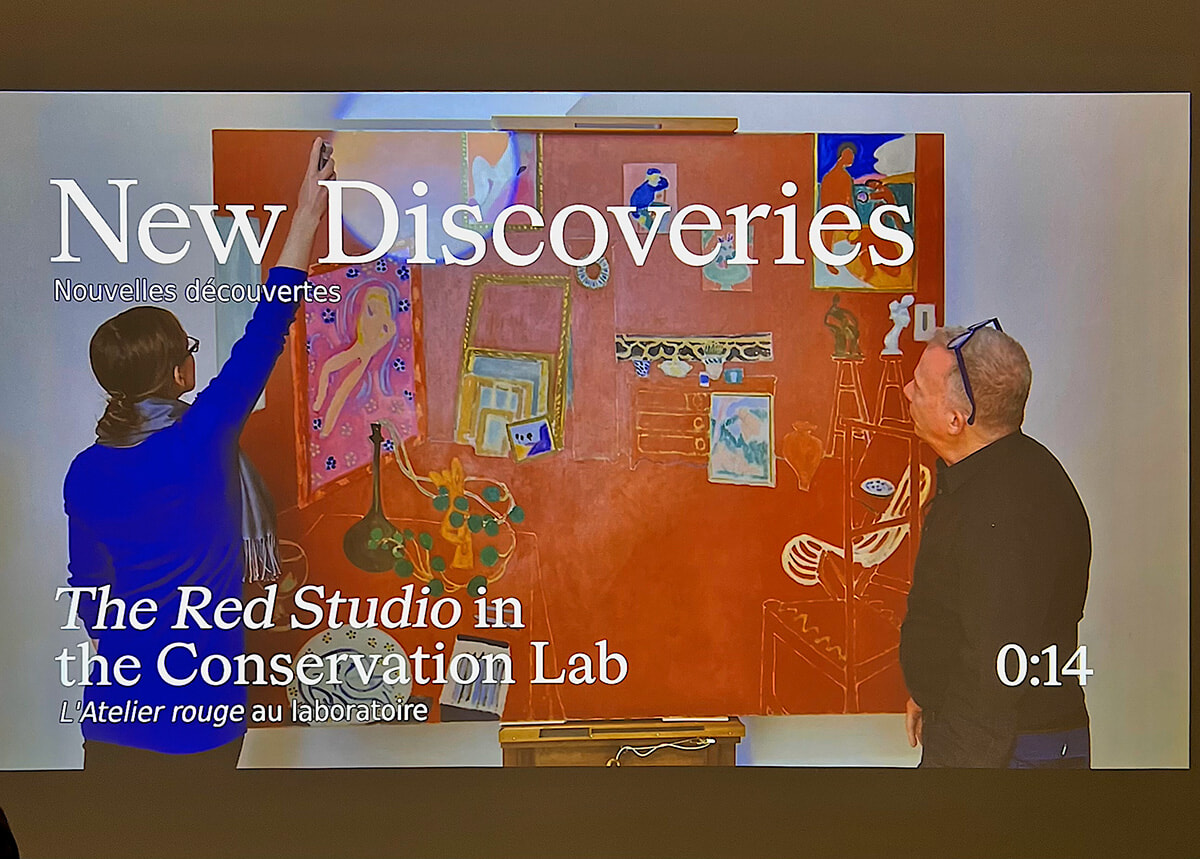 最後の部屋となるギャルリー7では、MoMAの保存・修復のチームによる『赤いアトリエ』の科学的分析についての7分間のビデオ上映だ。この作品は元々は壁も床も別の色で描かれていてもっと自然なアトリエの光景だったのを、マティスは最後にヴェネチアンレッドで塗り潰したことの発見などが明かされる。これは新必見!