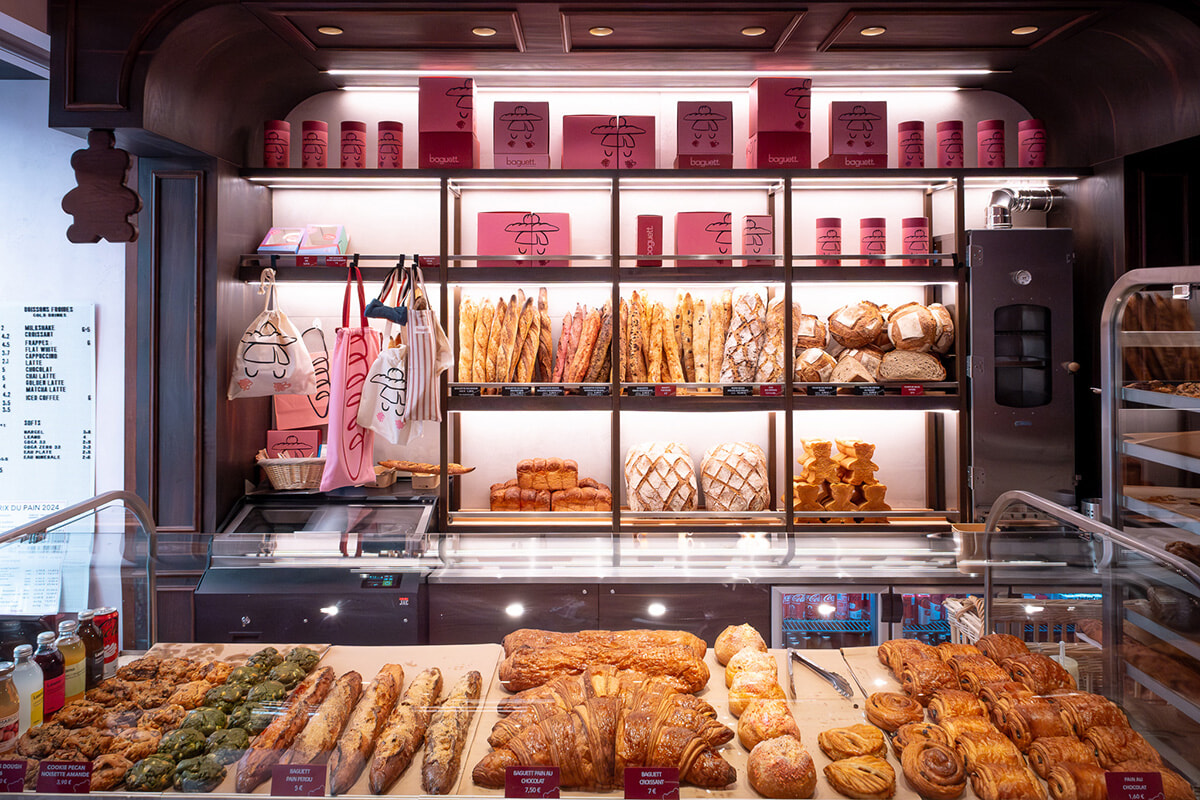 日本でもおなじみのパン職人エリック・カイザー。パリ1区に彼が新しく開いたお店はbaguett.(バゲット.)といって、エンターテイメント業界で長い経験を持つデボラ・マニャン率いるDébolandがアートディレクションとコンセプトを担当している。ピンクをメインに色があふれるポップなパン屋さんで、入るだけで明るい気分に。