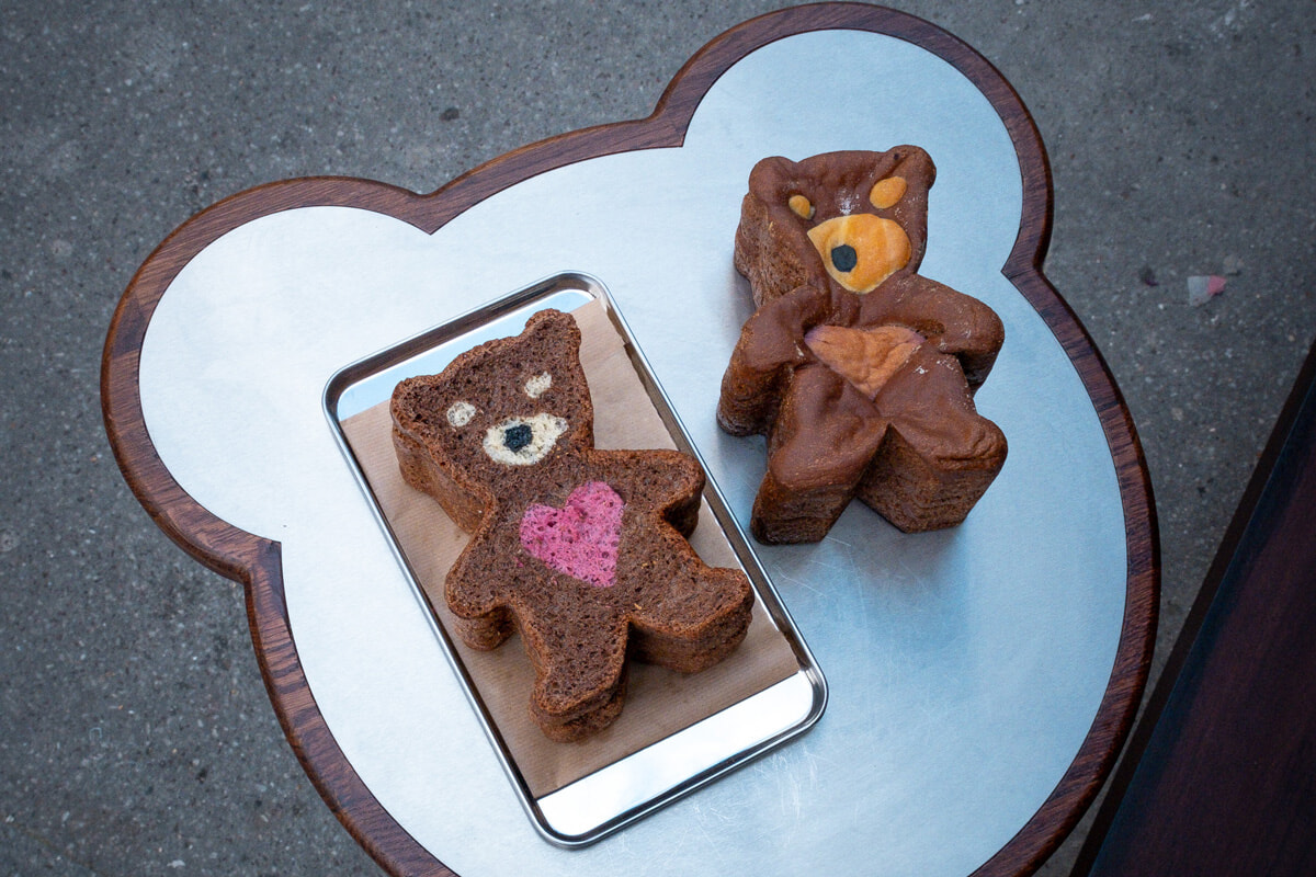 店内左はサンドイッチコーナーやサラダのショーケース、右はクッキーやフィナンシェなど粉菓子のショーケースで、その両方で目を引くのは熊さんの姿だ。これまでフランスでは熊のフォルムと言ったらチョコレートコーティングされたマシュマロの”ウルサン・ギモーヴ”が一般的だったけれど、ここバゲットではパン・ド・ミ、クロック・ムシュー、パティスリーなどにも! 可愛いので、 食べるのにちょっと勇気が要りそう。ゼロ廃棄物を目指すパン屋なので、前日のパンはパン粉となり、バゲットはパン・ペルデュに、そしてクロワッサンはグルメなアイスクリームに変身させられている。