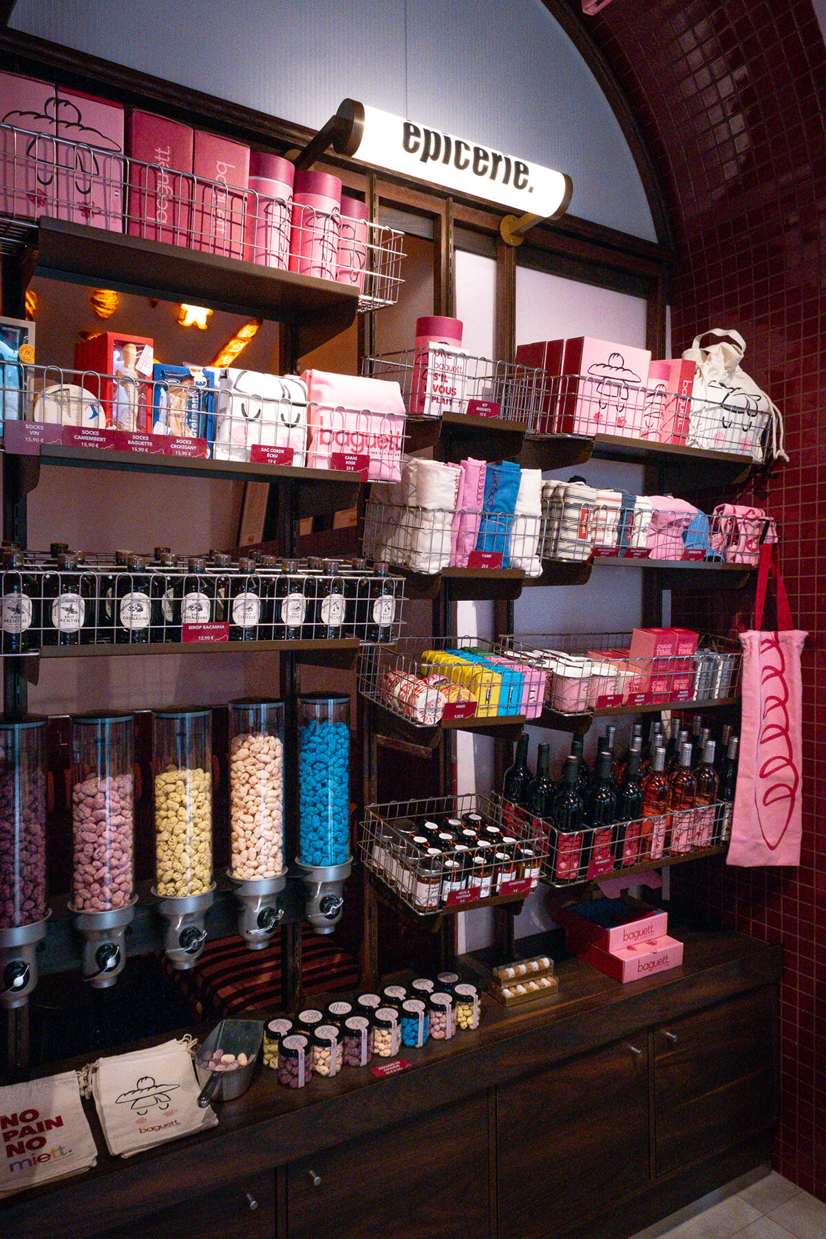 エピスリーにはロゴ入り商品がずらり。量り売りのアーモンド ・ドラジェはとてもカラフル。日持ちするのでロゴ入り袋に入れてお土産にしては?
