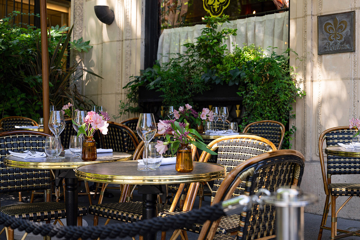 アール・ヌーヴォーの内装のレストランの前に設けられたテラス席。斜め前にマドレーヌ寺院が眺められる。photography: lephotographedudimanche