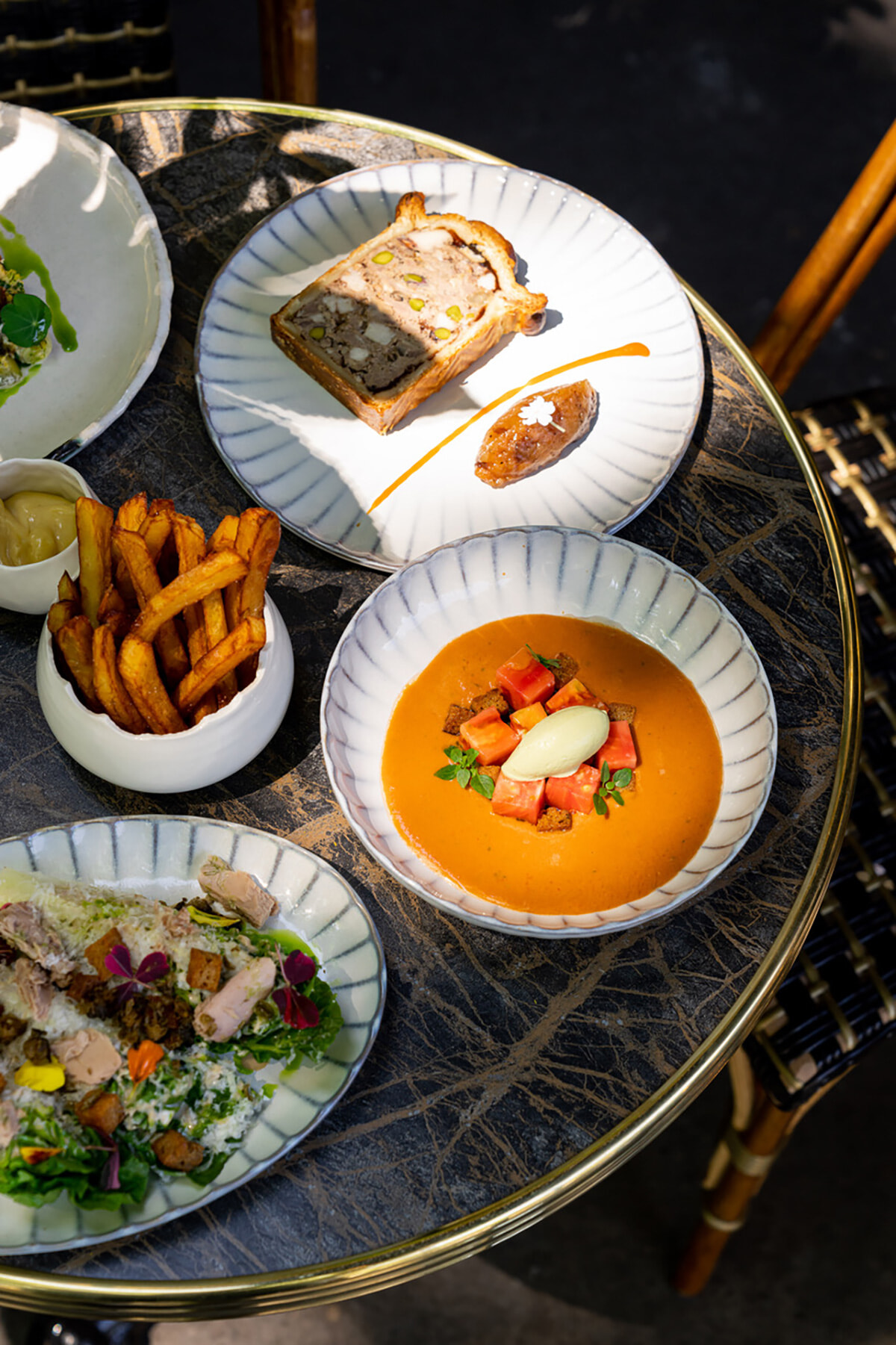 パテ・アン・クルート(25ユーロ)、バジリコ・シャーベット添えのトマトスープ(20ユーロ)など。photography: lephotographedudimanche