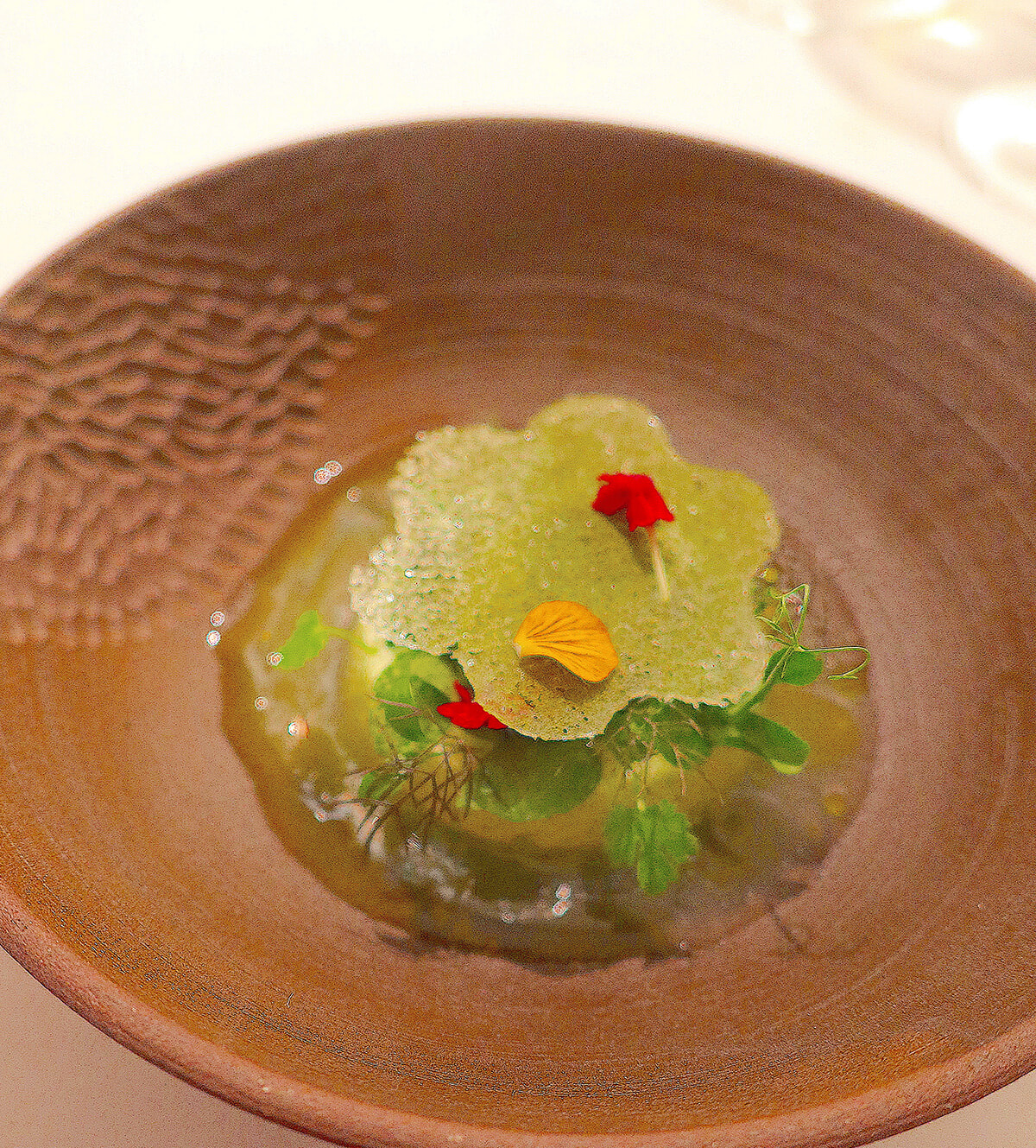 さて”おいしくて楽しい錯覚”について言えば、シェフにはエリック・ライナルというシェフ・パティシエの相棒がいる。シャトー・ドゥ・ベルヌで働くことをずっと夢見ていたという彼。クリエイションには愛するシャトーの畑がもたらす収穫物から多くのインスピレーションを得ていて、「糖分は軽めに、味わいはしっかり。私のデザートは季節のリズムと畑のリズムに従っています」と彼は語る。畑にシトロン・キャビアやコンバワといった珍しい柑橘類も育てられているのも、彼のアイディアだ。彼が食卓にもたらす錯覚の一例は、グリーンの色彩が爽やかなデザート「摘取り」だ。最近はハーブをデザートに用いるシェフ・パティシエは少なくないけれど、エリックが提案するのは一歩先取りしている感がある。甘み控えめで、またハーブの種類も複数盛り込まれているのでデザートと言っても料理との境界線がとても曖昧。ル・ジャルダン・ドゥ・ベルヌはテーブルに着き、食事が終わるまで不思議な感覚の旅ができるガストロノミー・レストランだ。