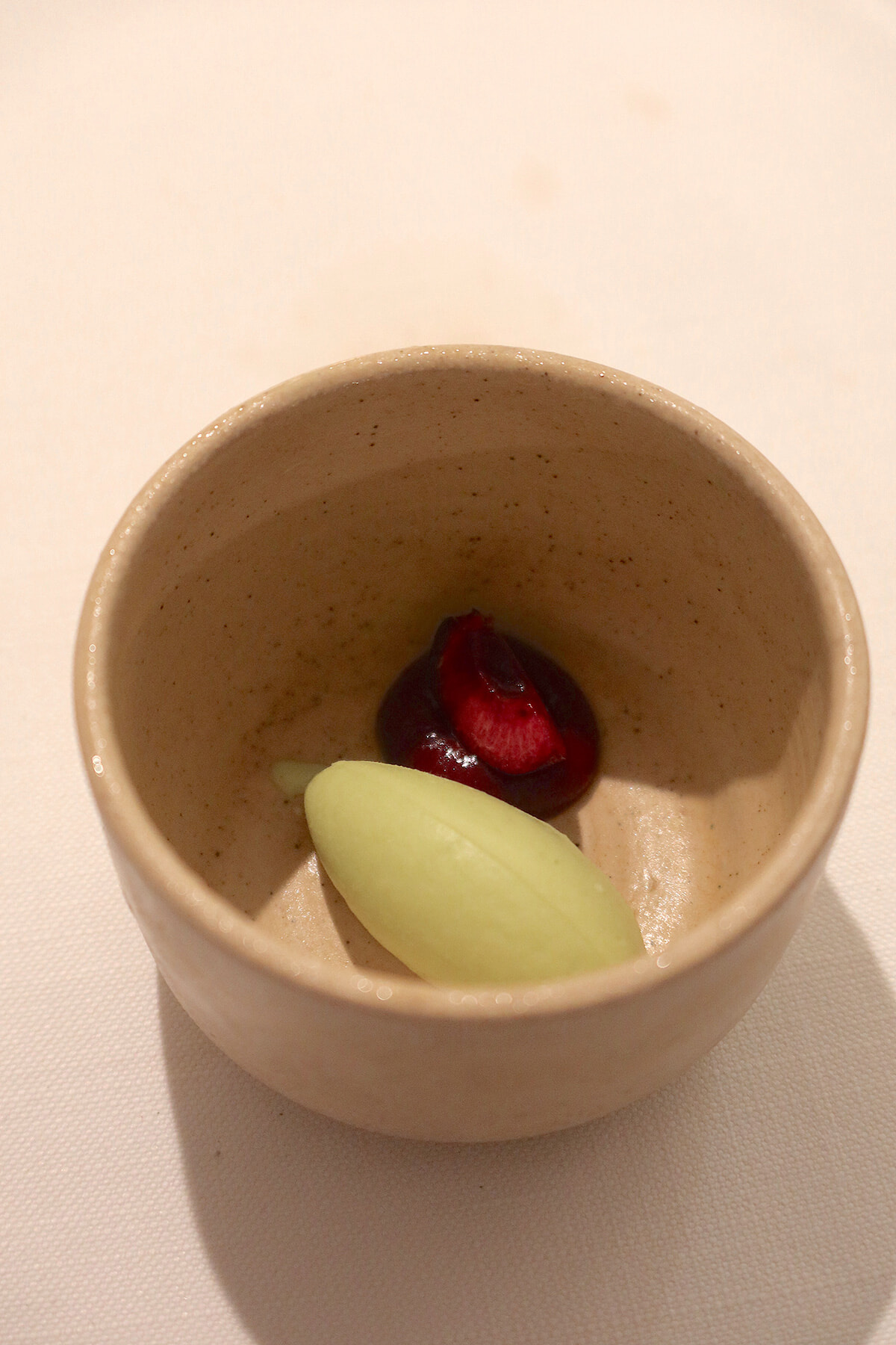 グリーンピースのシャーベットとチェリーのデザート。畑の恵みだ。photography: Mariko Omura
