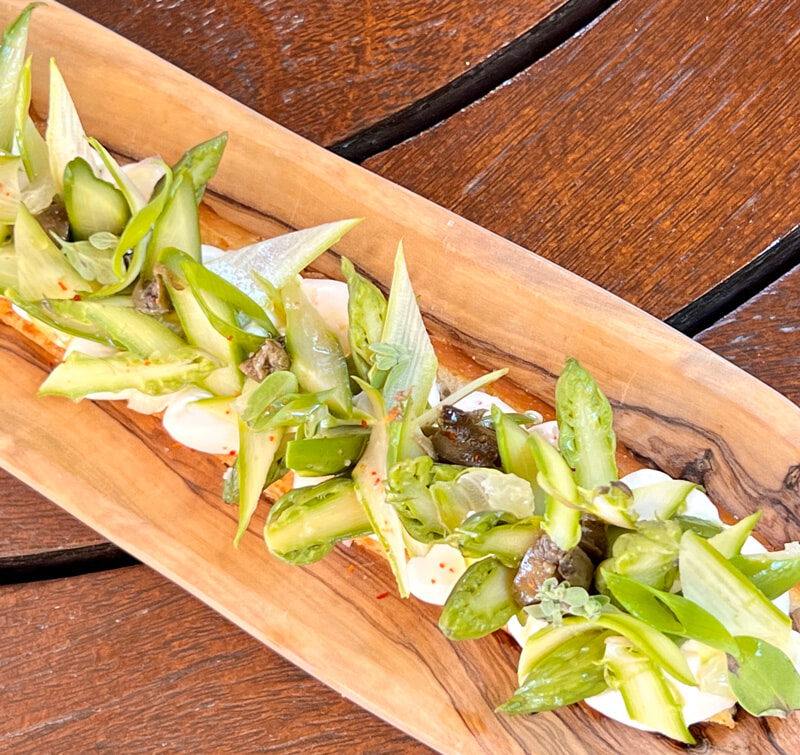 麦の穂のようなフォルムで焼かれたフォカッチャの上に野菜とチーズをのせた前菜。photography: Mariko Omura