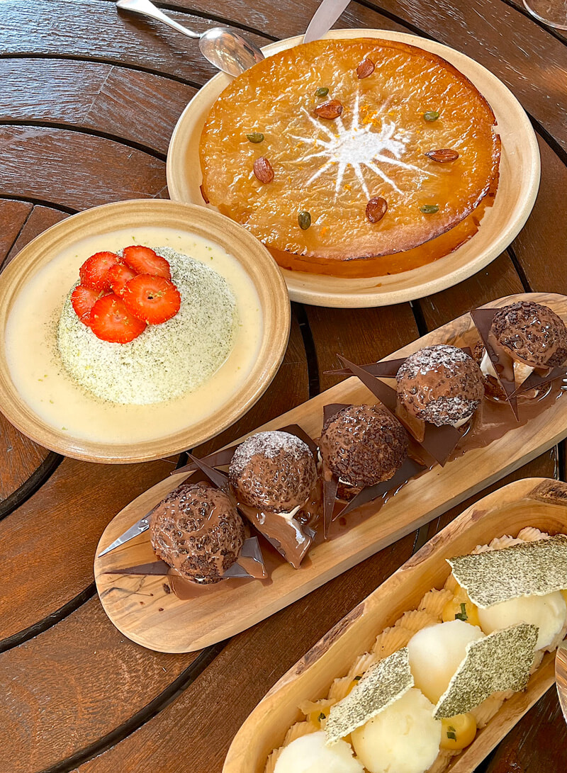 デザートは上から、アーモンドミルクのクリームとフルーツが間に挟まったパスティーヤ、畑のイチゴをのせたイル・フロッタント、チョコレートのシュークリーム、パヴロヴァ。photography: Mariko Omura