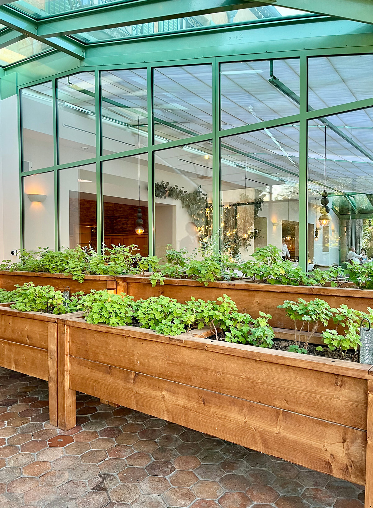 ペラルゴニウムが植えられた緑の通路を抜けてレストランへ。photography: Mariko Omura
