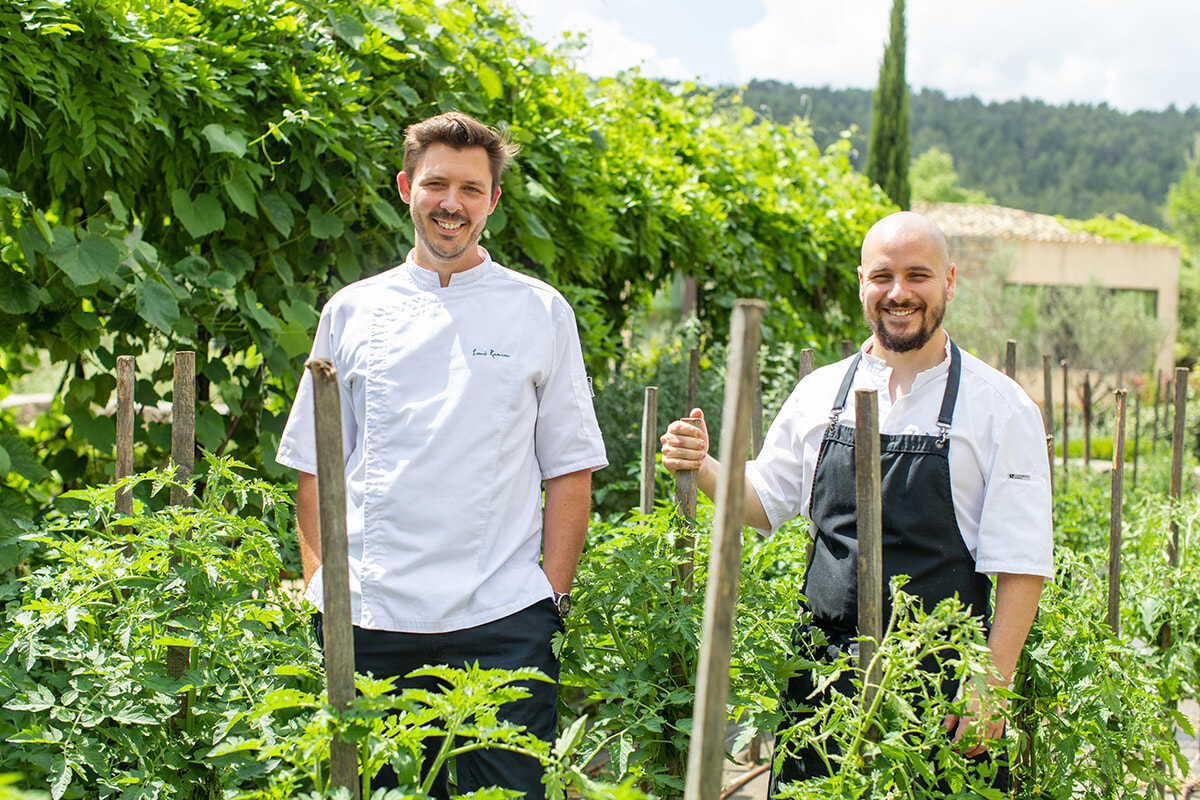 シェフのルイ・ラモー(左)とシェフ・パティシエのエリック・ライナル。ふたりにインスピレーションを与えてくれる野菜畑にて。©️LeaGil