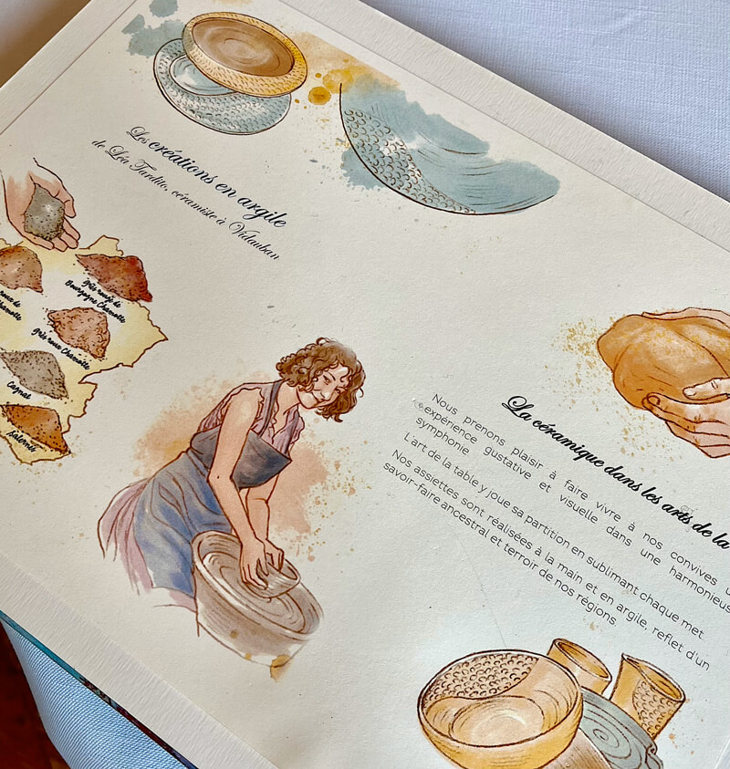 イラスト入りメニューは料理だけでなく、近隣の素材の産地も地図入りで紹介。最後にはレストランが使う食器を作る地元の陶芸家の仕事も紹介されている。photography: Mariko Omura