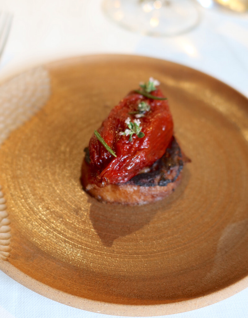 トマトとパン。ごくシンプルな材料で奥行きの深い前菜をシェフはクリエイト。photography: Mariko Omura