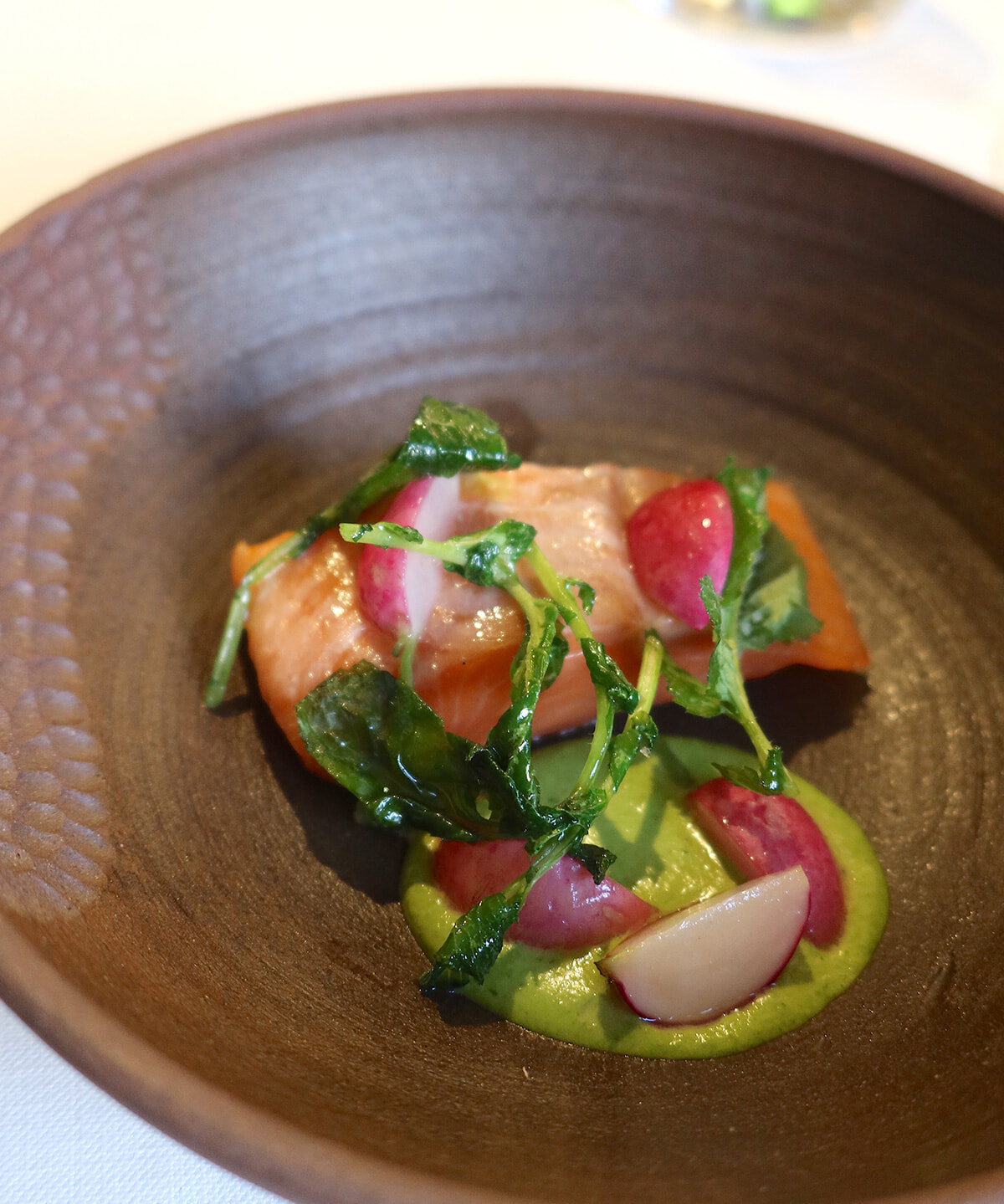 メインの魚料理。地元のマスは低温調理で。ラディッシュ、ニンジンの葉のペスト、ニワトコの花の白いバターソースなど畑の恵みをたっぷりと。photography: Mariko Omura