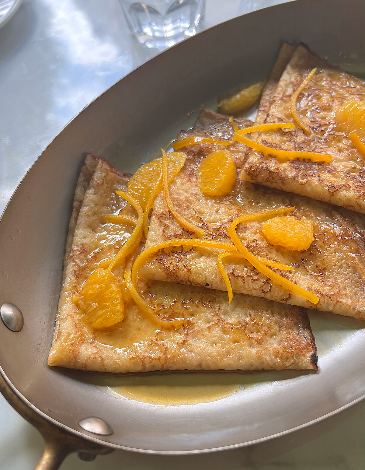 オレンジとラムの風味のクレープ・シュゼット(10ユーロ)。なかなか見つからないクラシックなデザートのひとつだ。photography: Mariko Omura