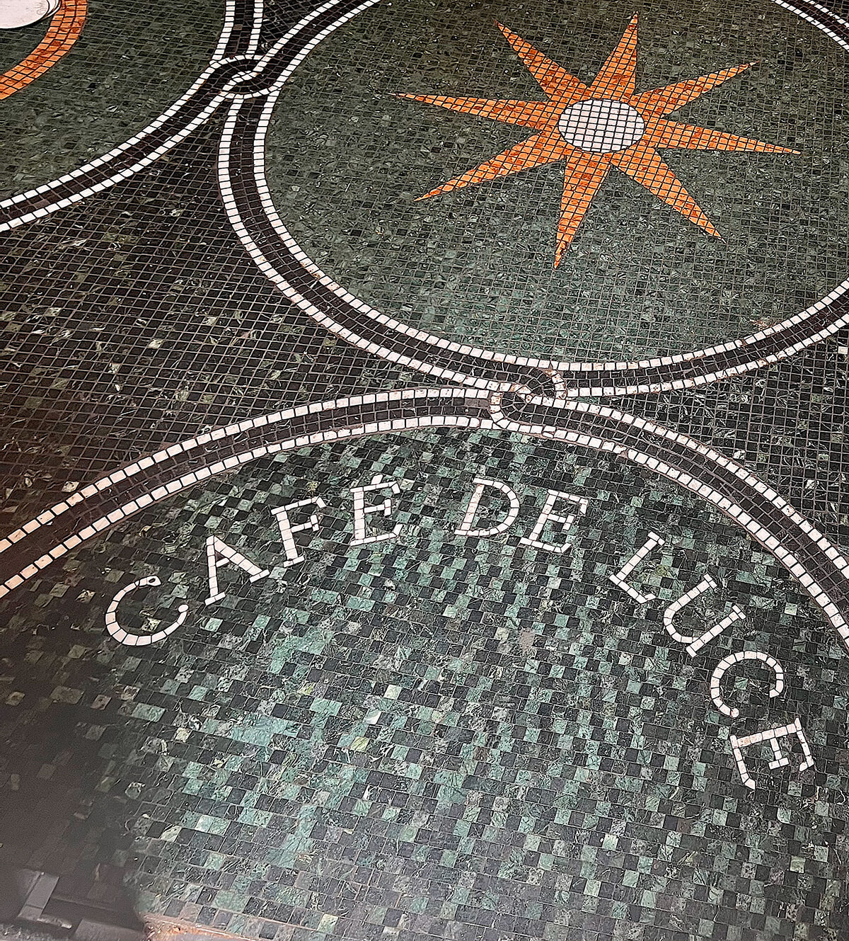パリの昔ながらのビストロのように、カフェ・ドゥ・リュースの入り口にもモザイクタイルが。photography: Mariko Omura