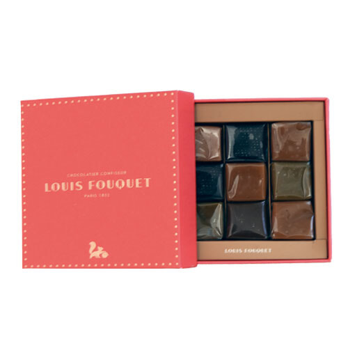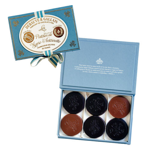 美しいブルーのボックスが目印。チョコレートに描かれたジュエリーなどの模様もエレガントで、味わいも繊細。王妃のストーリー背景もあり、最強のフランス土産! ピストル・ドゥ・マリー=アントワネット25ユーロ