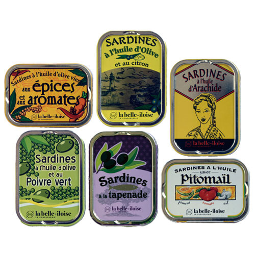 フランス西部、ブルターニュ地方の伝統的製法で作られるサーディン缶。オイル漬けやハーブ漬け、トマト味など味のバリエーションも豊か。ポップなパッケージはばら撒き土産にも最適。6個セット23.95 ユーロ