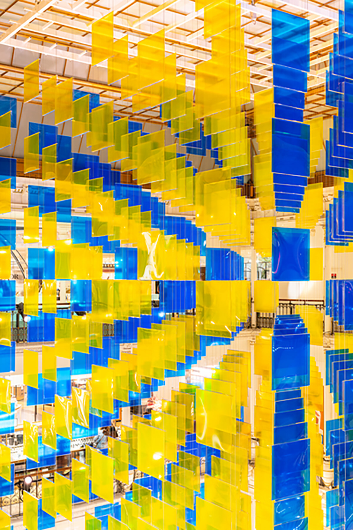 セーブル通りに面した8つのウィンドウを50センチ四方の白と8色のダミエが飾り、ウィンドウとウィンドウの間に縦のストライプが描かれているのは第1幕と同じ。建物の4箇所のエントランスの小さなスペースで、1965年以来変わらぬダニエル・ビュランおなじみの8.7cm幅のストライプに来店者は迎えられる。メインピースはデパート本館の中心部! アンドレ・プットマンがデザインしたX字に交差するエスカレーターの左右に、吹き抜けの天井からそれぞれ756枚のカレが吊り下げられている。セーヴル通り側の吹き抜けは黄色とブルー、エスカレーターの反対のバビロンヌ通り側は赤とグリーン。エスカレーターに乗って上下するとカラーパネルに照明が抜けて異なる表情の色遊びが見られるのが楽しい。アートギャラリーでの展示では味わえないアートの体感。ボン・マルシェから買い物客に素敵な贈り物だ。なお期間中、夏に似合うストライプの大きな布バッグを販売している。第2幕のパネルの色である黄色、グリーン、赤、ブルーの4色だけれど、すでに売り切れてしまった色も!