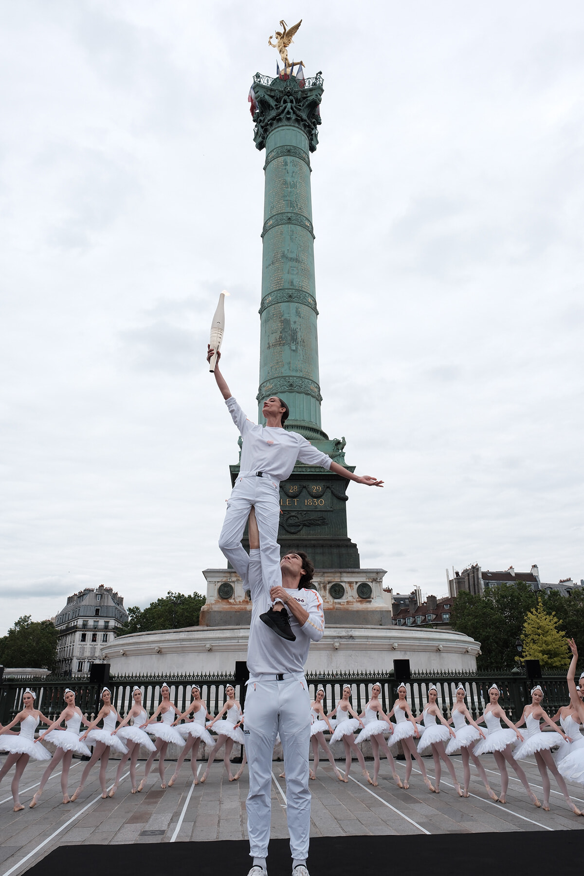 今年のフランスはパリ・オリンピック年。ふくらはぎの怪我で残念ながら『白鳥の湖』を降板したドロテだが、7月14日に白鳥の衣装をつけたコール・ド・バレエのダンサーたちを背景に、バスティーユ広場でエトワールのユーゴ・マルシャンと聖火を掲げたことは既報のとおりである。このユニークな体験からまずは語ってもらおう。