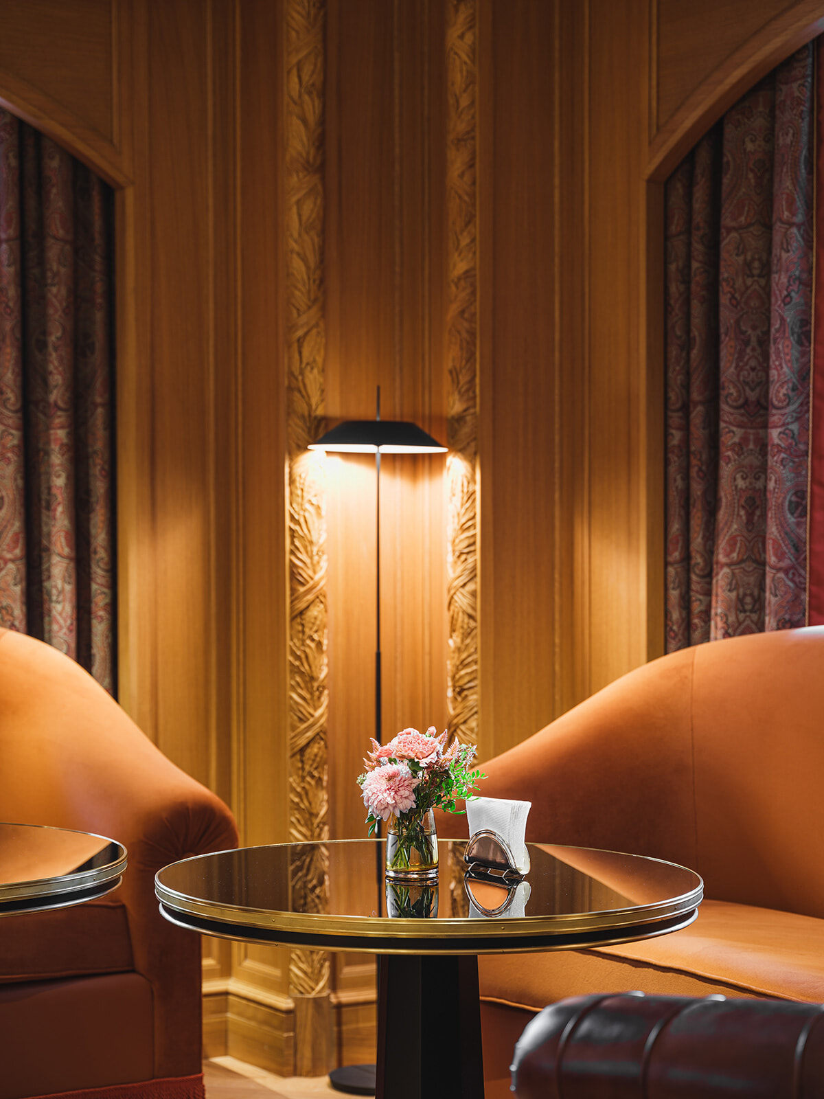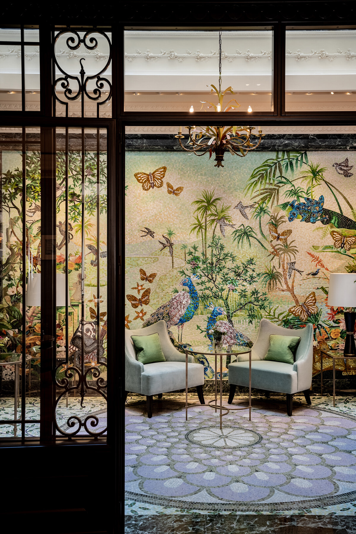 半円形の窓が並ぶこのフロアで広場とサントノーレ通りのコーナーを占めるのは、プライベートクラブ的な雰囲気を漂わせる大きなライブラリー・サロンだ。宿泊客はここで思いのままに時間を過ごせる。食事やティータイム、読書……周囲の棚には文学、ガストロノミー、車といったテーマの本が並んでいる。これらはショイフレ家のコレクションからだという。個人宅の雰囲気のクリエイトには書籍のみならず、ショイフレ家が収集するさまざまなジャンルのコレクションからの品がホテルにパーソナルタッチをもたらしている。ラリックの花器だったり、客室内のイヴ・クラインの作品だったり。同じフロアには夜中営業している落ち着いた雰囲気のバーがあり、さらにガラス屋根の下にはコージーなウインター・ガーデンが。ヴェニスの職人によるパット・ドゥ・ヴェールと大理石を用いた見事なモザイクの魅力に目を奪われる空間だ。モザイクに始まり、ホテル内の改修には石工職人、家具職人、寄木細工職人、金箔職人、機織り職人、鋳造職人、石膏装飾職人……さまざまな分野で卓越した腕を持つ職人たちが関わっている。150年以上の時計とジュエリーのクリエイションを支えるサヴォワールフェールの継承を大切にするショイフレ家らしい。
