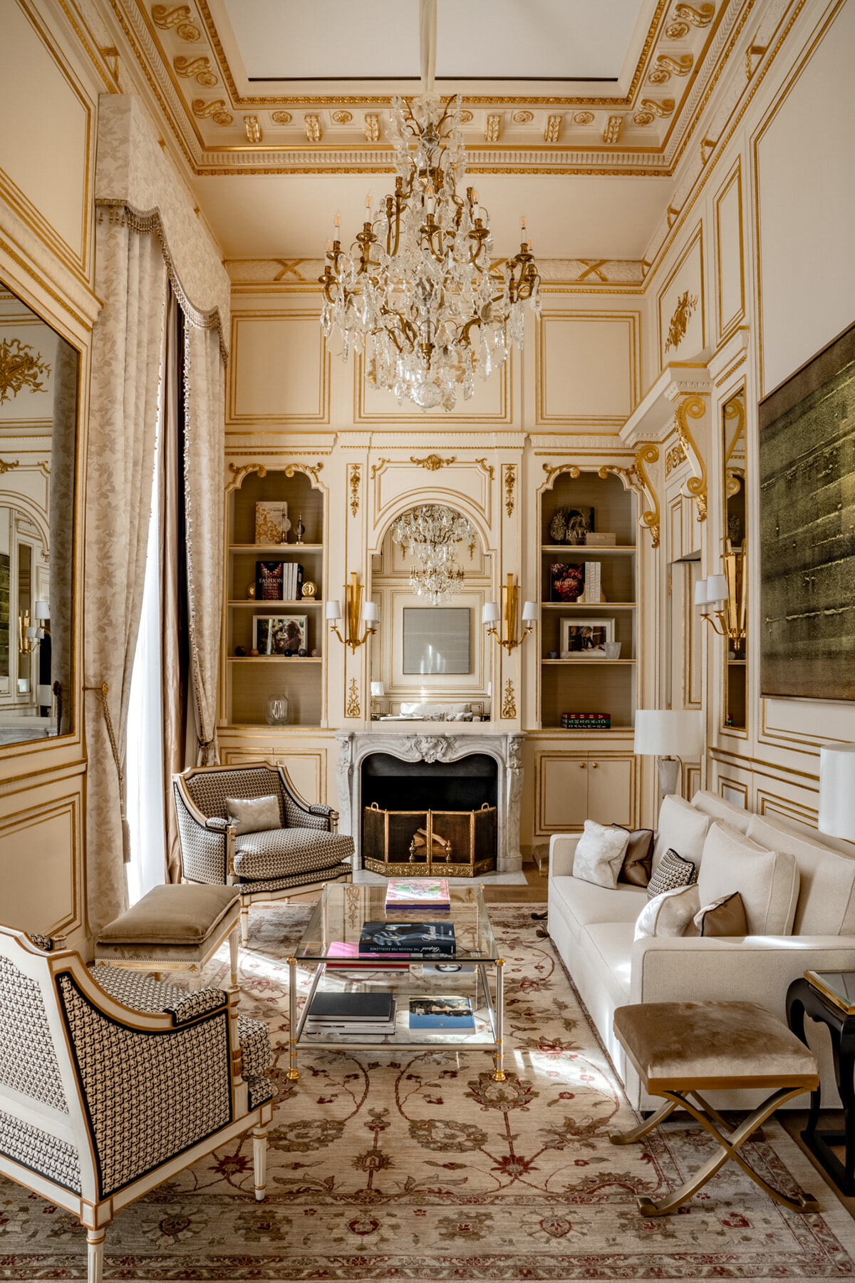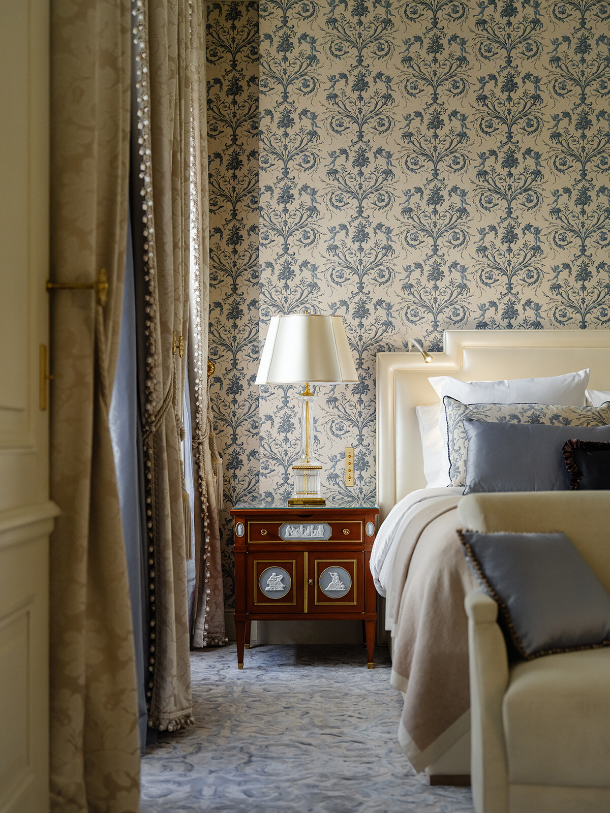 広場に面したほかの建物と同じくここも1930年に歴史的建造物に指定されていて、ホテルのファサードも屋根も広場の建築時のままである。1番地はかつてホテル・ドゥ・ヴァンドームがあった場所で、10年前にショイフレ家が買収。そのホテルをクローズし、5年をかけての改修工事によってスイート10室を含む合計15室のホテルに変貌を遂げたのだ。室内建築を任されたのは、ラグジュアリーなホテルやレストランを多く手がけているピエール=イヴ・ロション。エレガンスと洗練あふれるホテルの誕生である。