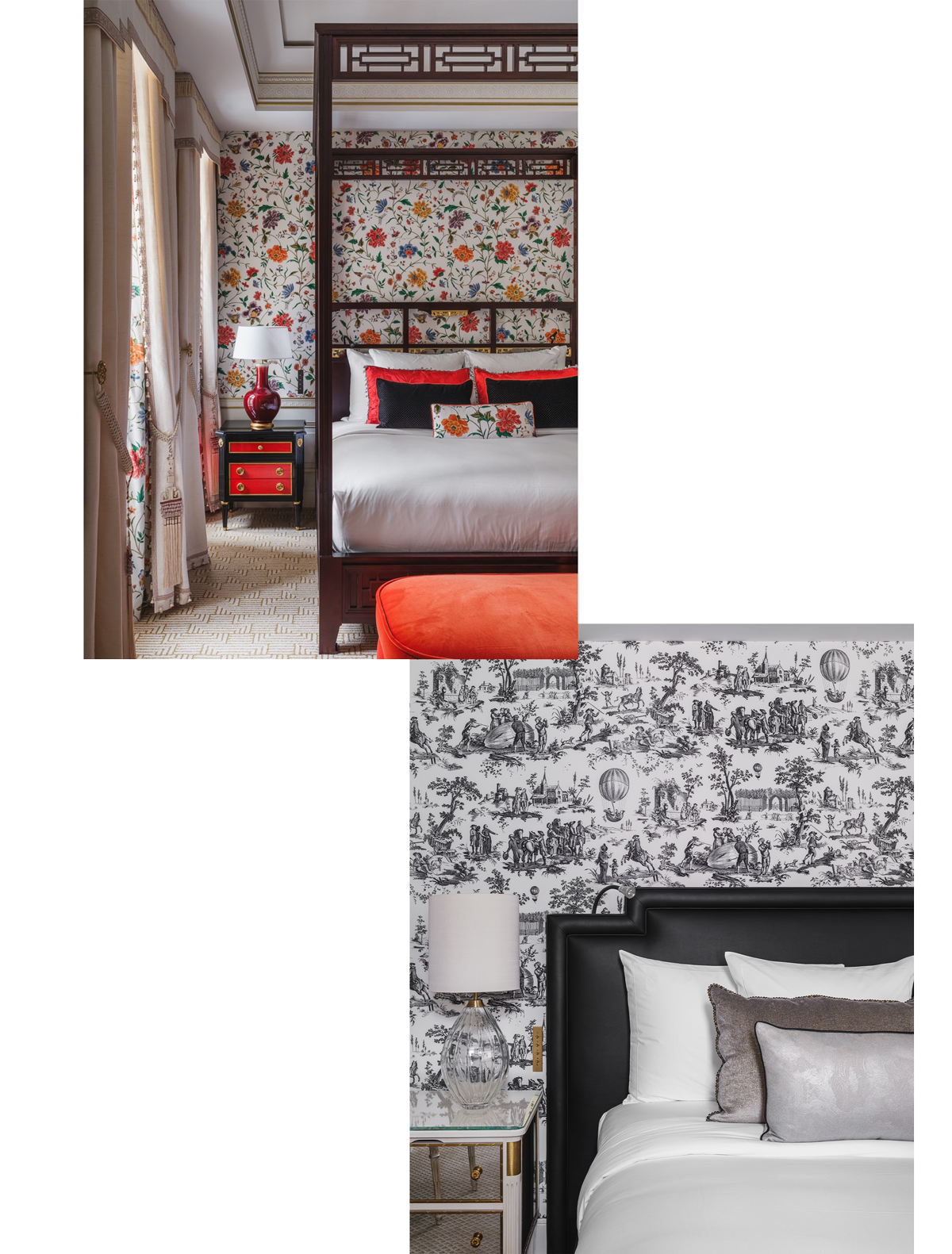 建物の2階から7階を占める15の客室に上がるエレベーターは珍しいシリンダー状。これはいまの時代には制作不可能な貴重なフォルムなので改修に際し、保全されることになったそうだ。部屋にはそれぞれショパールのメゾンに結びつく宝石や時間に関わる名が授けられている。時にまつわる星がインスピレーションとなった「Astrologie(アストロロジ/占星術)」、ひし形モチーフと白い輝きでまとめられた「Diamont(ディアモン/ダイヤモンド)」、ベッドの黒革のヘッドボードがマニッシュな「Boussole(ブーソル/羅針盤)」、アジアンテイストの「Jade(ジャド/翡翠)」……フェミニニティが華やかに開花する部屋は「Paraiba(パライバ/南米のトルマリン産地)」だ。それぞれが個性的なので、常連の宿泊客は同じ部屋ではなく、毎回新しい部屋を選ぶとか。