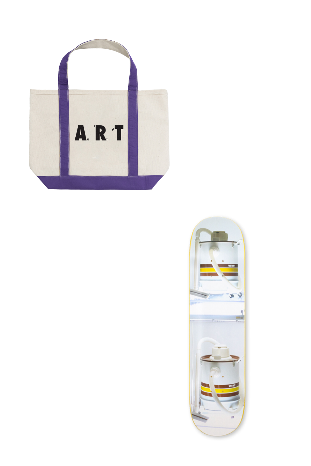 左: ヘビー・キャンバス・トートバッグ 70ユーロ 右: The Skateroomのジェフ・クーンズ作品のキックボード。