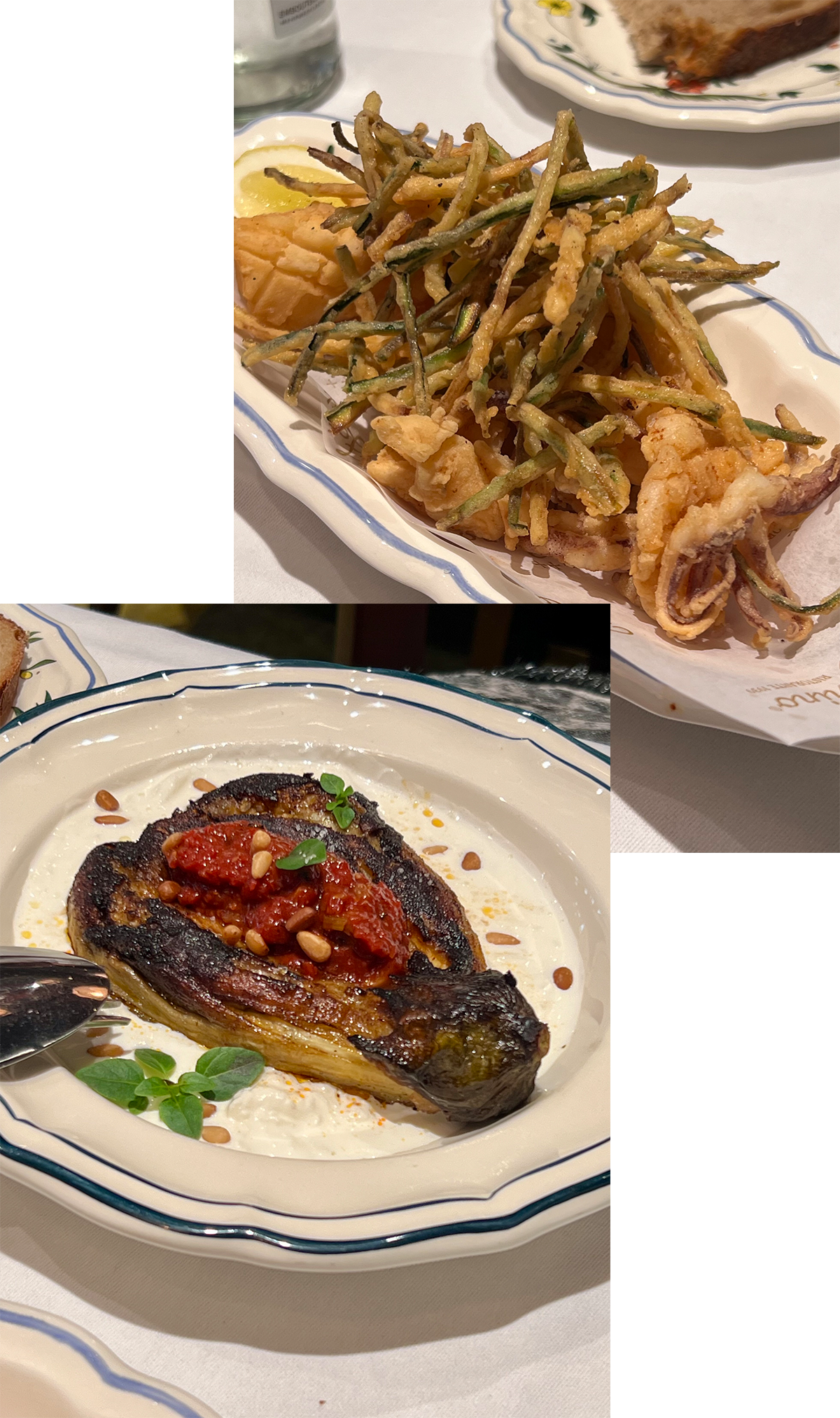 メニューを見ると焼きたてフォッカチャが3種類あり、前菜はズッキーニ&イカのフライやアボカドときゅうりのサラダなど。パスタは先に紹介した2つを含め8種類も。魚と肉はそれぞれ2種。高級店であるがランチタイムなら、前菜+パスタまたはメイン+グラスワインで39ユーロとお手頃価格で食事を楽しめる。