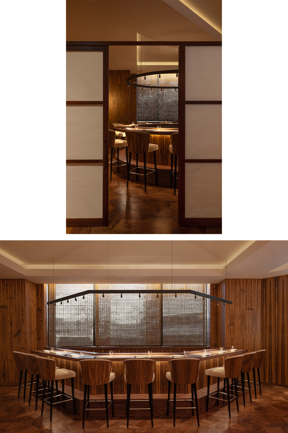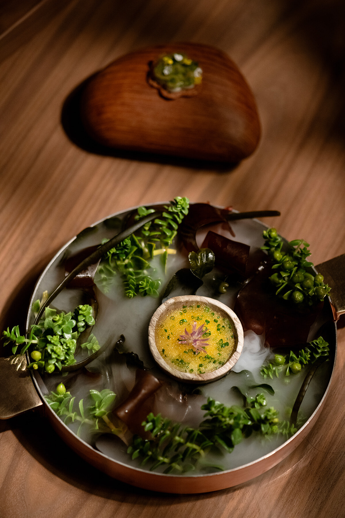 ハクバで繊細なのは料理だけではない。内装を担当したのはピーター・マリノで、彼は障子を連想させる白に木枠の壁の落ち着いたシンプルでコンテンポラリーな空間を作り上げた。カウンターは温かみのある色と柔らかい感触の黒胡桃の木だ。最初は石のカウンターというアイデアだったところ、アルノー・ドンケルが音を吸い込むような優しい胡桃の木を希望したという。そのカウンターに次々と登場する京都などで選ばれたというクラシックなうつわも見事。空の状態ではうつわそのものが主役になれる美しさを備えながら、料理が盛られるや、それをおいしそうに引き立てる役を見事に果たしている。カウンターの上のスポットライトは、料理人の手元を照らし、ついで客の前に出された料理へと切り替わり……単に着席して食事をするだけの体験ではなく、まるで何かのショーに参加しているような気分も味わえるのだ。