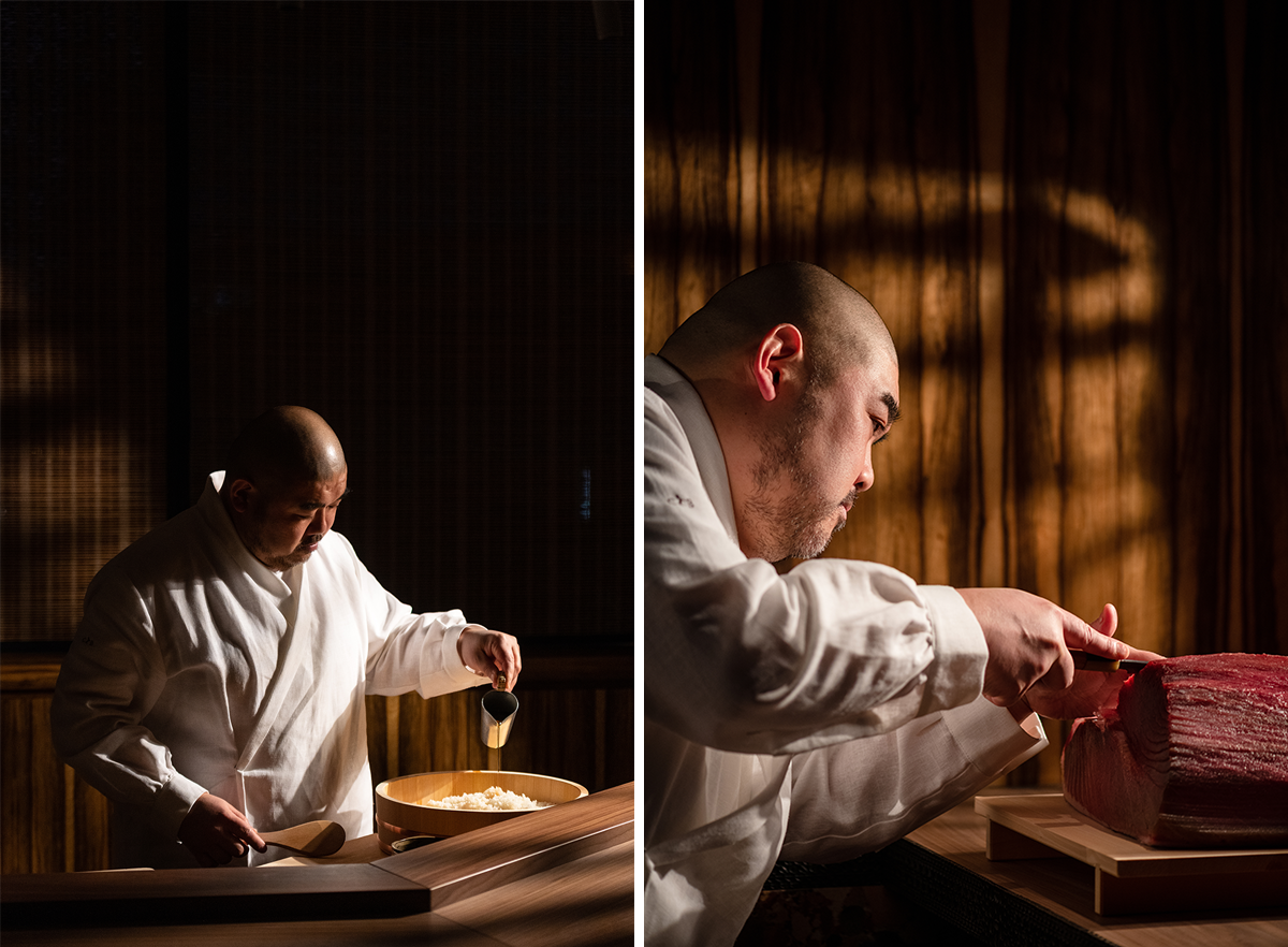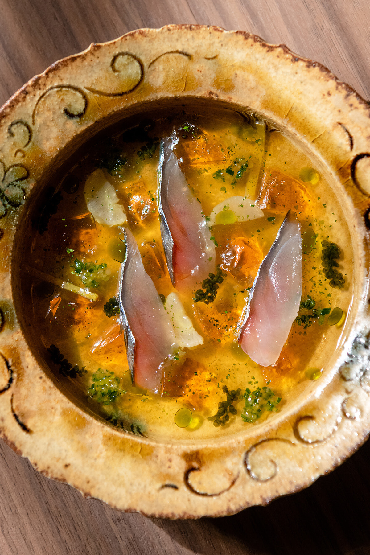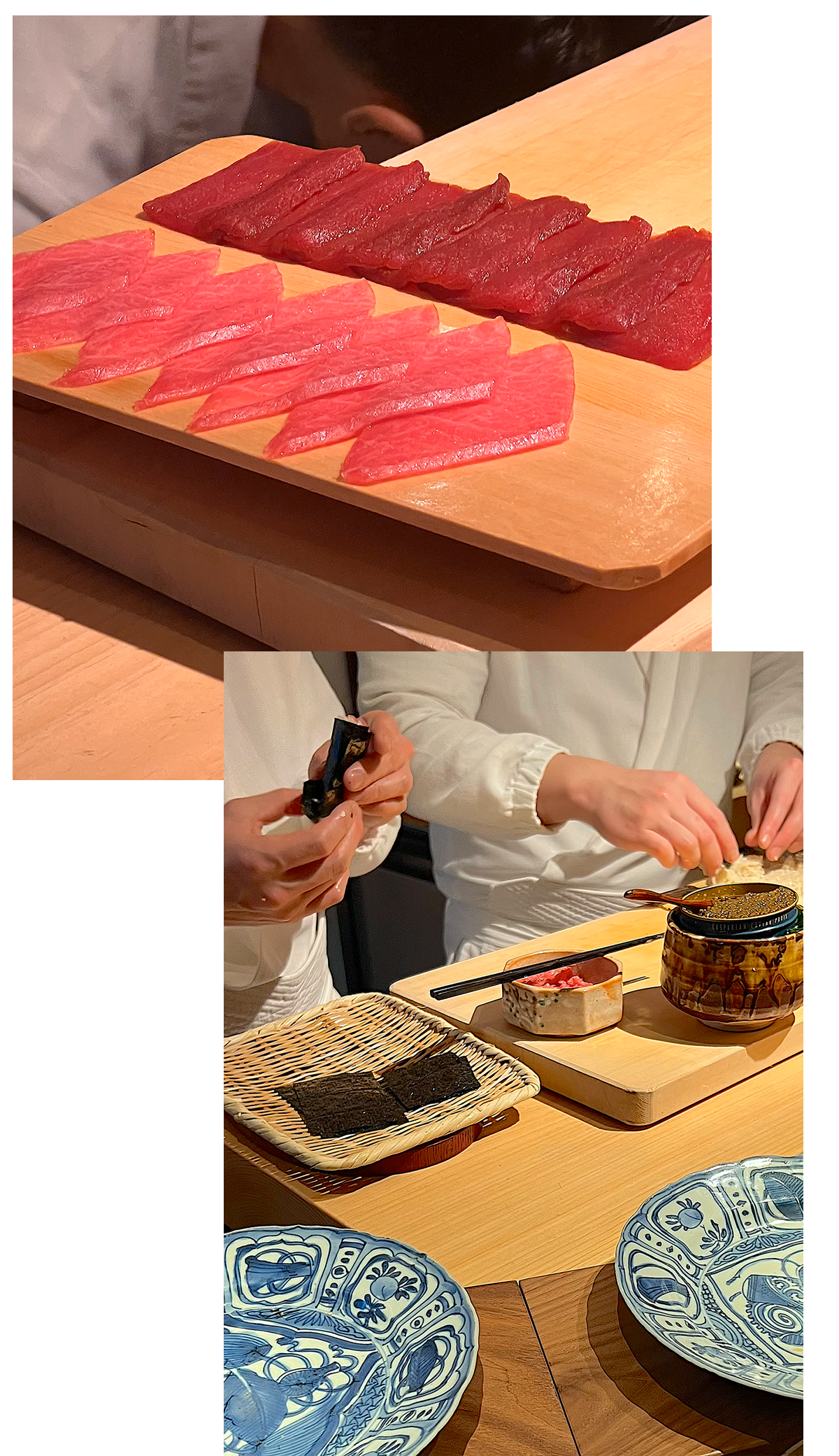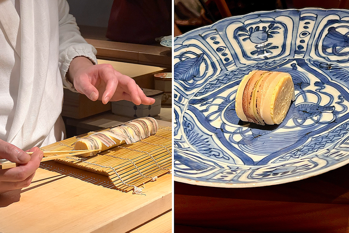 大きく3つに分かれたメニューは、驚きと魅力に溢れた3楽章による交響曲のよう。海苔の佃煮とブイヨン、茶碗蒸しでスタートする第1楽章は海の幸がハーモニーを奏で、お鮨で構成された第2楽章は春小鯛に始まり太巻きまでクレッシェンドでアップテンポで進んでゆく。そして第3楽章。繊細なフルーツの甘みが優しく締めくくる。食感や味覚のバリエーションが素晴らしい。伊勢海老を口に含むと酸味がぴゅっと味を添え、炙った牡蠣のお鮨はかんずりの旨みあるほのかなピリピリ感と一体となり、イカのお鮨に潜むわずかな生姜味が深みを演出。ヒメジの炭焼きから放たれる香りには自然と鼻が動かされ、シソの葉の天ぷらの衣が口の中で立てるカリッと軽い音にも耳を澄ませたくなり……五感を研ぎ澄まして味わう。消えゆく味わいを堪能すべく目を閉じてしまいそうになるのだけれど、カウンターの中で進行する料理人たちの細かい手仕事を見逃したくもなく、これはちょっとしたジレンマ!