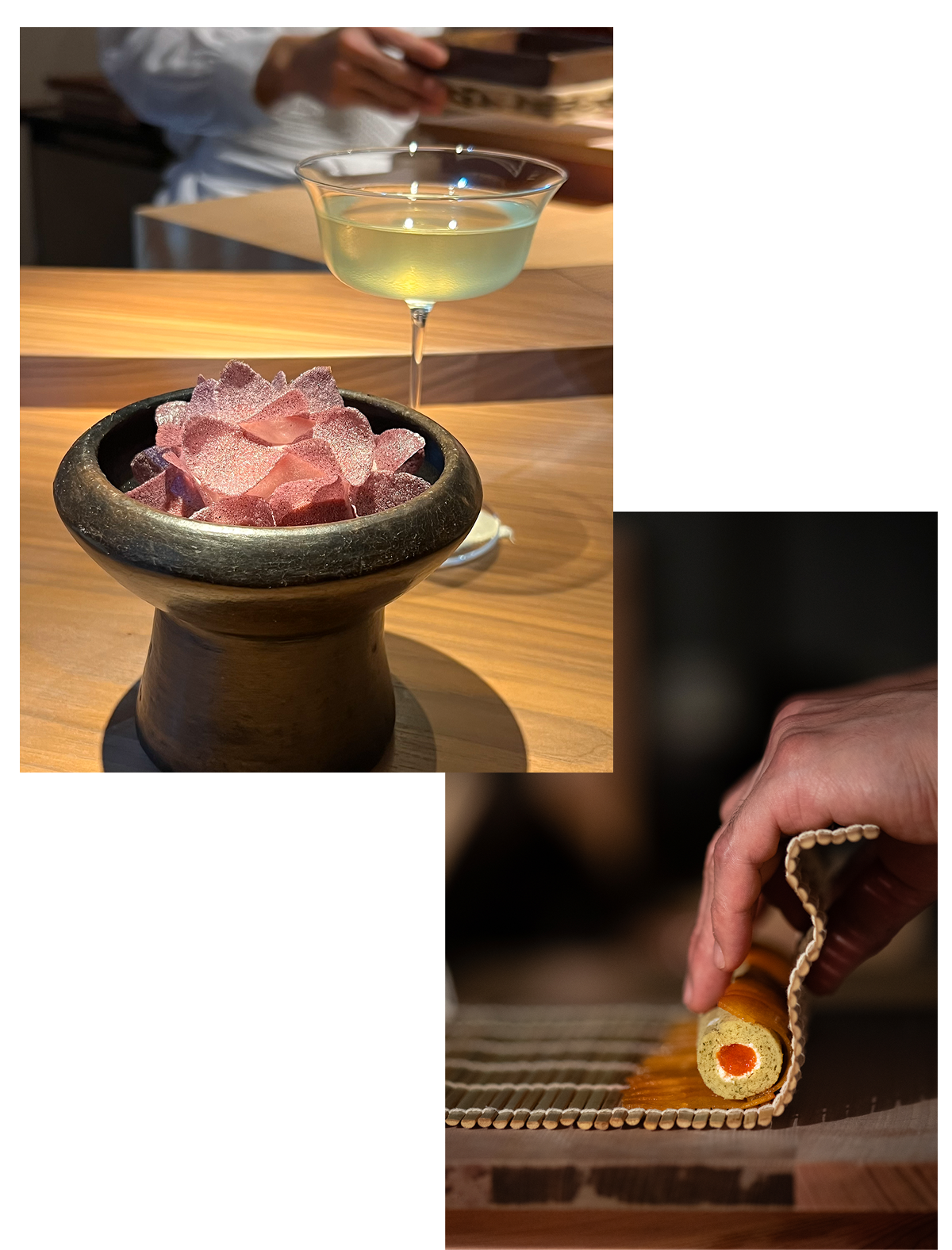 風味や食感をはじめ、卓シェフはアルノー・ドンケルとすべての料理についてコラボレート。ドンケルはソースの専門知識や経験を生かして、味を最大限に引き立たせることをハクバで目指しているという。アルノーとの出会いについて渡邉卓也シェフは、「最も美しい日本料理を生み出す創造的な融合になるとすぐに確信しました」と語っているように、ハクバで登場するのはふたりのシェフの創造性がひと皿の中で完璧に溶け合った日本料理である。最終章の甘みはマキシム・フレデリックが日本の伝統とフランス菓子の職人技を融合。最近フランスではちょっとした餅ブームで子どもでも”mochi”が何かを知っているけれど、マキシムは流行を超えて、日本の甘み文化の象徴として餅を捉えたレシピを考案した。素材は黒米、梅、餅など……登場するひとつひとつの甘みはどれも麗しく輝き、まるで宝石のようだ。