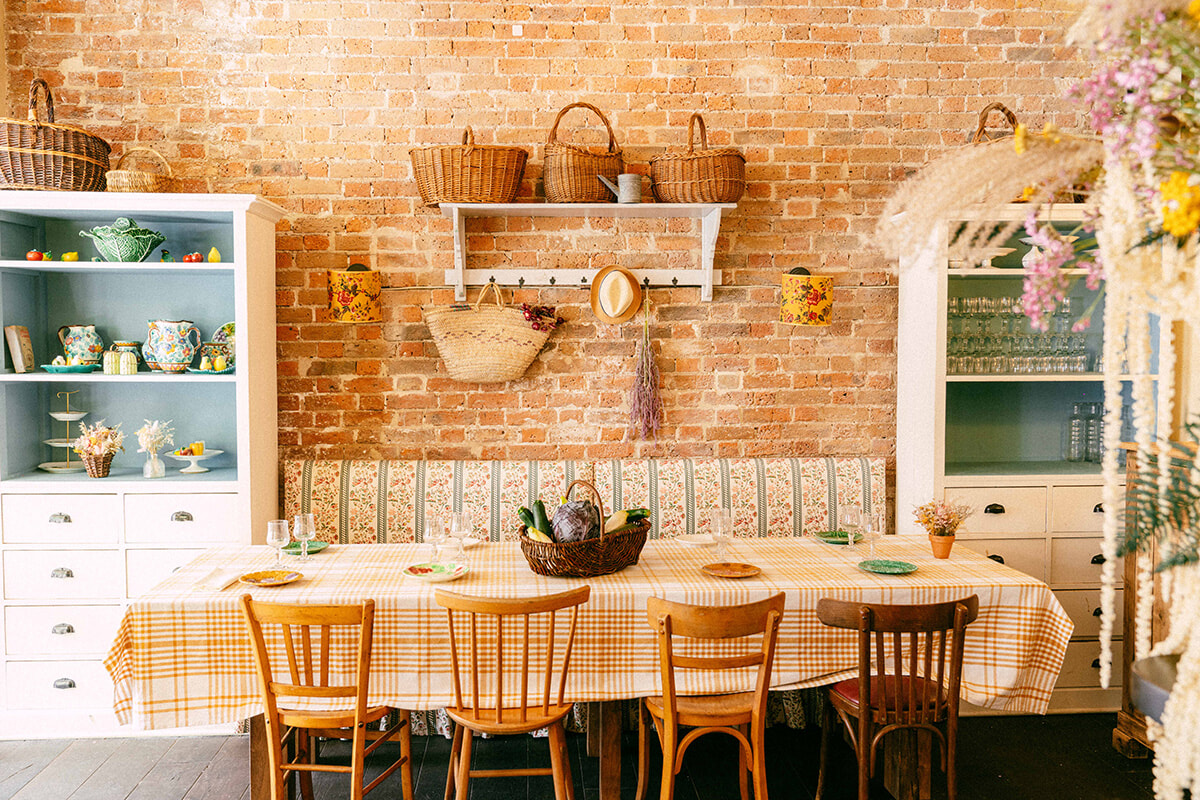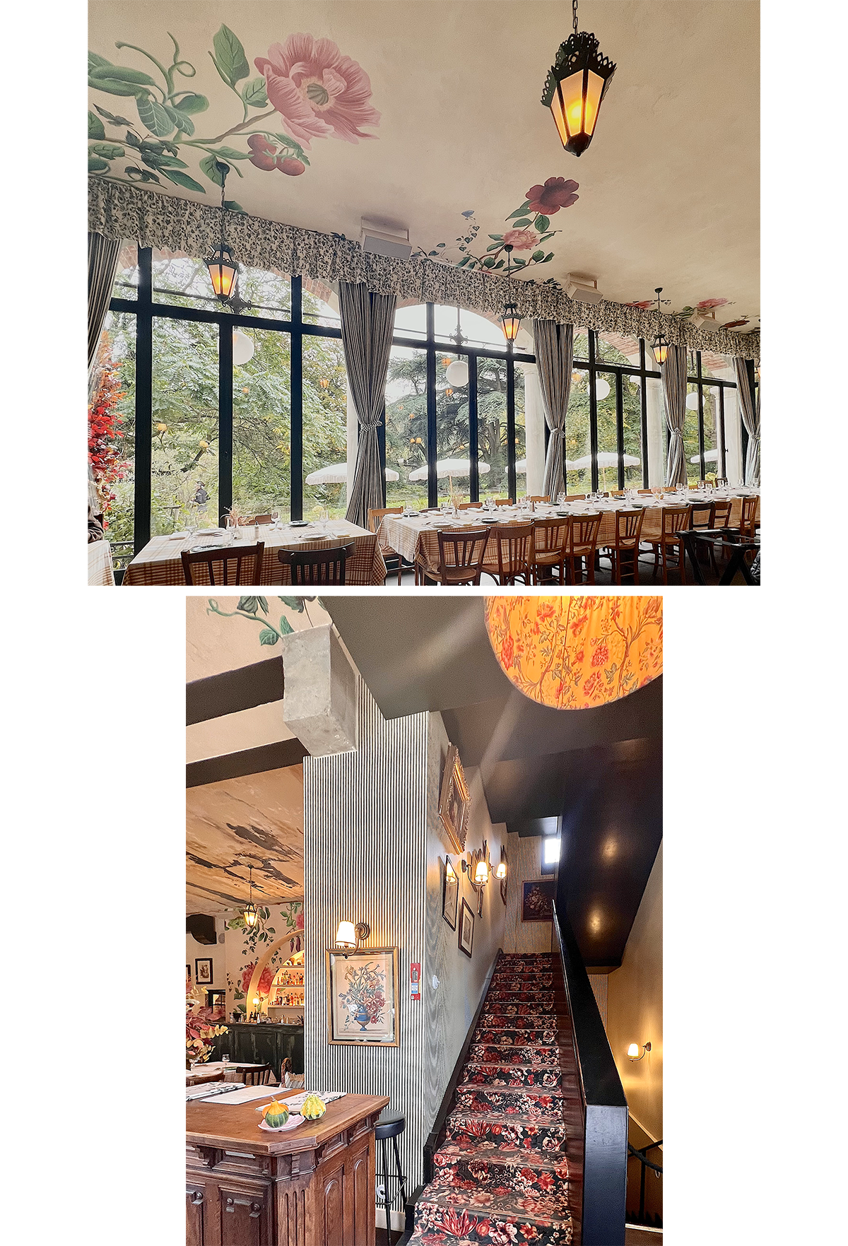 湖に近く、以前は「Pavillon du Luc (パヴィヨン・デュ・ラック)」と呼ばれる19世紀後半に建築された建物で、壁も天井もそして化粧室にいたるまでレストラン内には植物があふれている。内装を任されたのはコーデリア・ドゥ・カステラーヌである。自然をこよなく愛する彼女らしいインテリアデザインが、すごく愛らしい。チェックのテーブルクロスや壁に掛けられたバスケット……公園の中に田舎のウィークエンドハウスが出現!といった雰囲気だ。