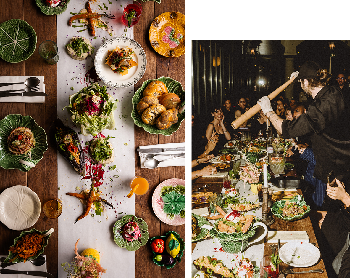 ディナーは季節で内容が変わるベジタリアンのおまかせメニューだ。耐水性の高いパーチメント紙のランナーをテーブルの中央に敷いて、シェフがそこにヴェジタルペインティングをしたりといったショータイムとなる。テーブルの上で仕上げられるベジタリアンメニューに加え、ディナーのオプションメニューとして魚料理、野菜のリゾットやカマンベールのローストなどのオーダーが可能だ。