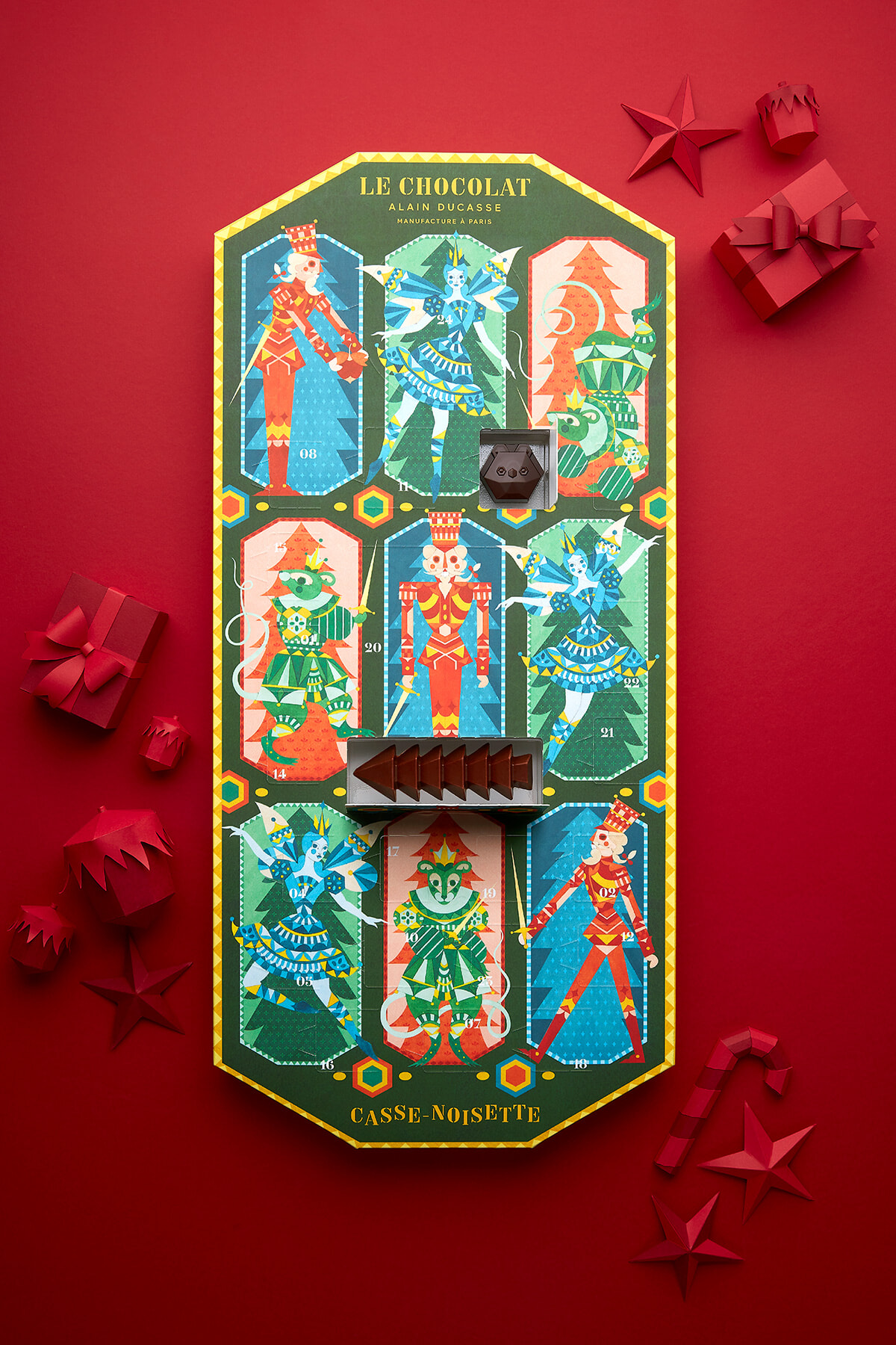 食べ終わった後も保存しておきたくなるのは、12月1日から24日まで毎日が『くるみ割り人形』の世界となるアドベントカレンダーだ。主人公クララの夢の中で王子様に変身するくるみ割り人形、バレエ学校の生徒たちが着ぐるみで扮している小ネズミたちを率いる黒い巨大なネズミの王様、クリスタルのように澄んだ響きのチェレスタが奏でる曲に乗せてポワントで踊るドラジェの精(金平糖の精)。ルー・ベネッシュによるイラストでバレエに登場するキャラクターたちが描かれた小さな窓を開いて、毎日おいしい驚きを発見する喜び! ヘーゼルナッツのプラリネのブラックチョコレートやミルクチョコレート……このカレンダーのためにクリエイトされた味も潜んでいる。クリスマスイヴの12月24日は特別な日。いちばん上の窓を開くと、さあ、どんなスイートドリームが飛び出すか。