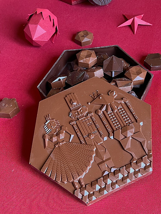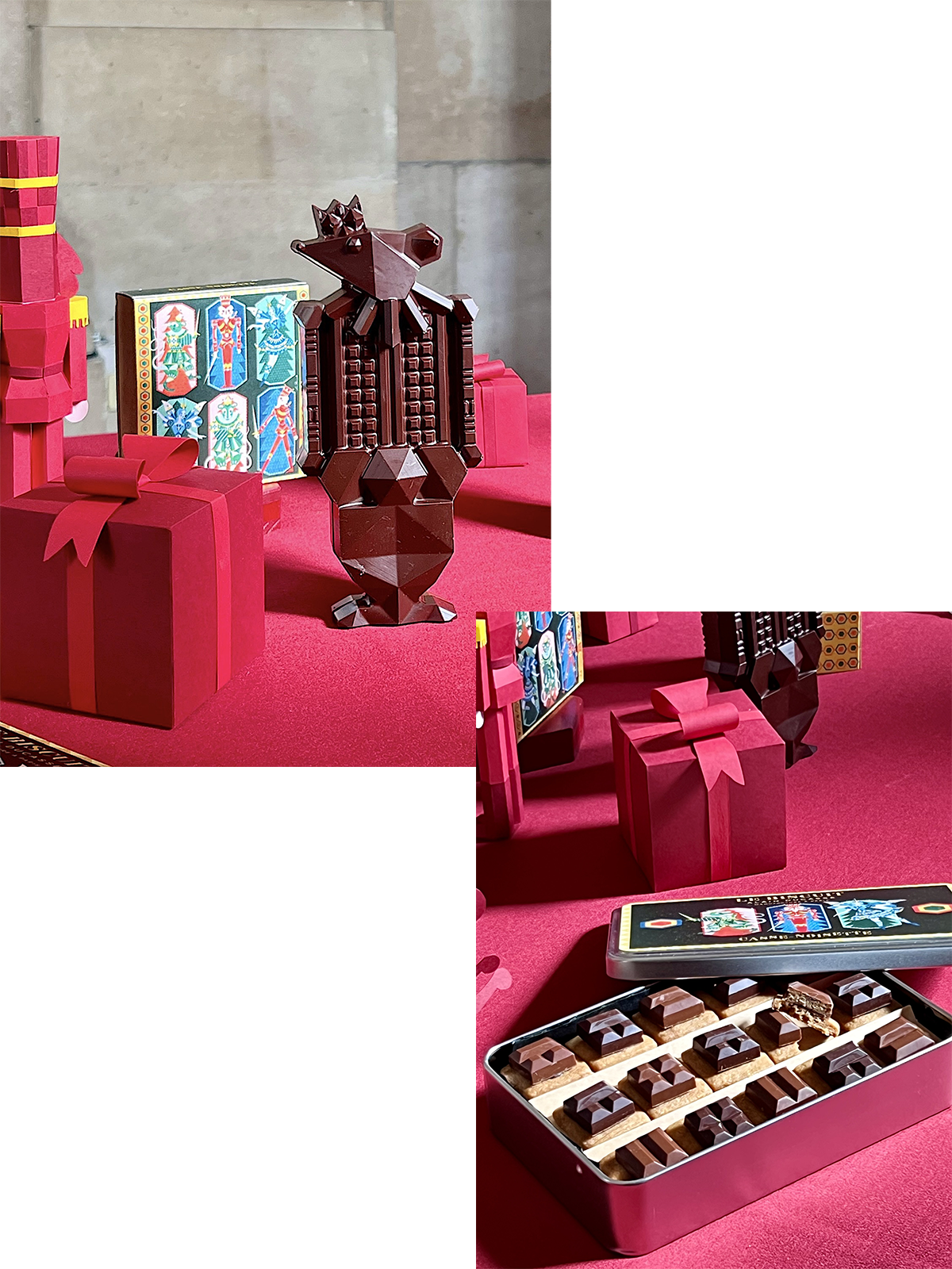 コレクションの中には、イラストではなくチョコレートでくるみ割り人形、ドラジェの精、ネズミの王様が浮き彫りされているボンボニエールも。おなじみの六角形のうつわの中には、ノエルがテーマの小さなチョコレートが詰められている。このボンボニエール、食べるのがちょっとためらわれるかも……。アドベントカレンダーとボンボニエールは、日本でも販売中。