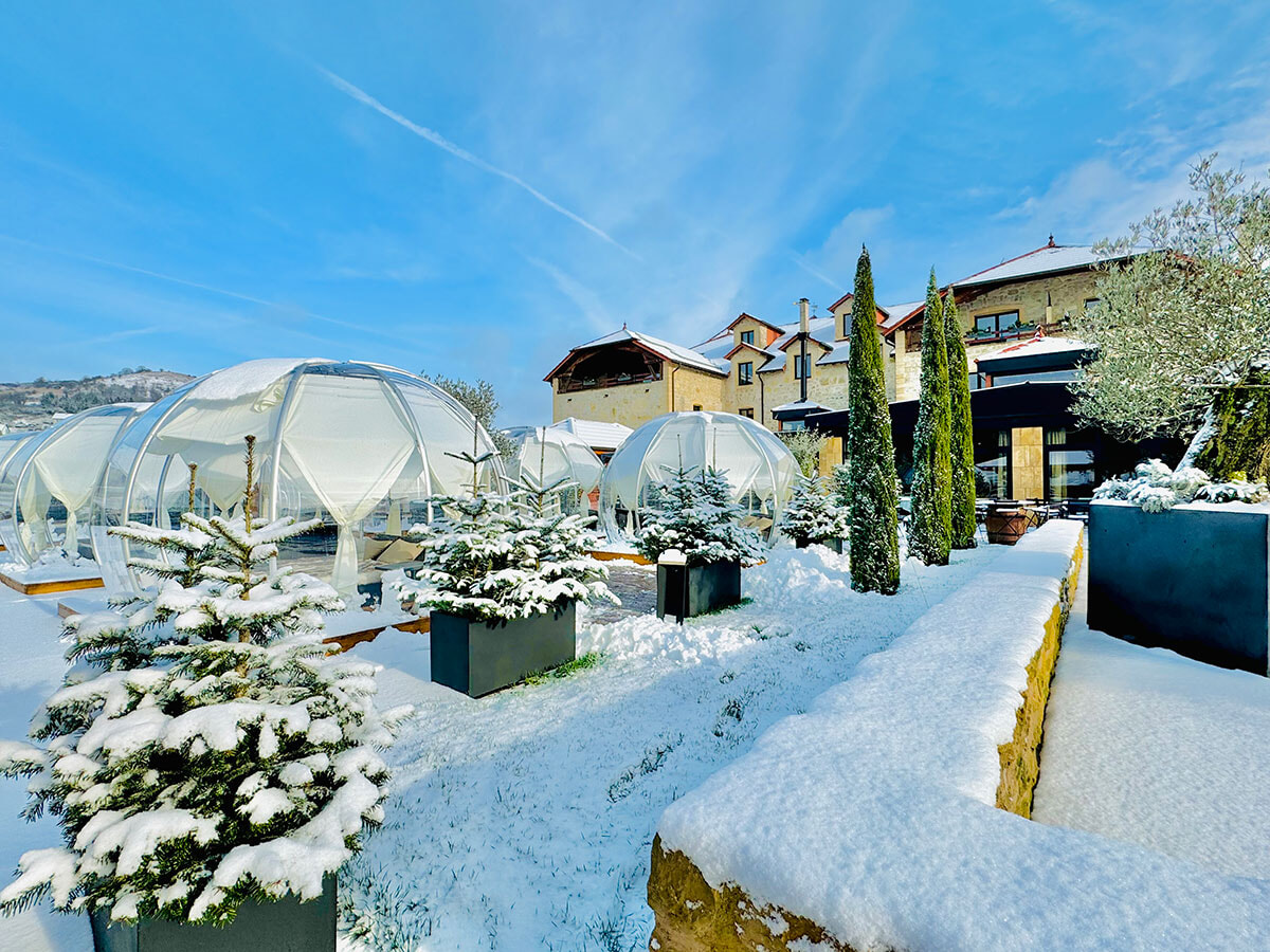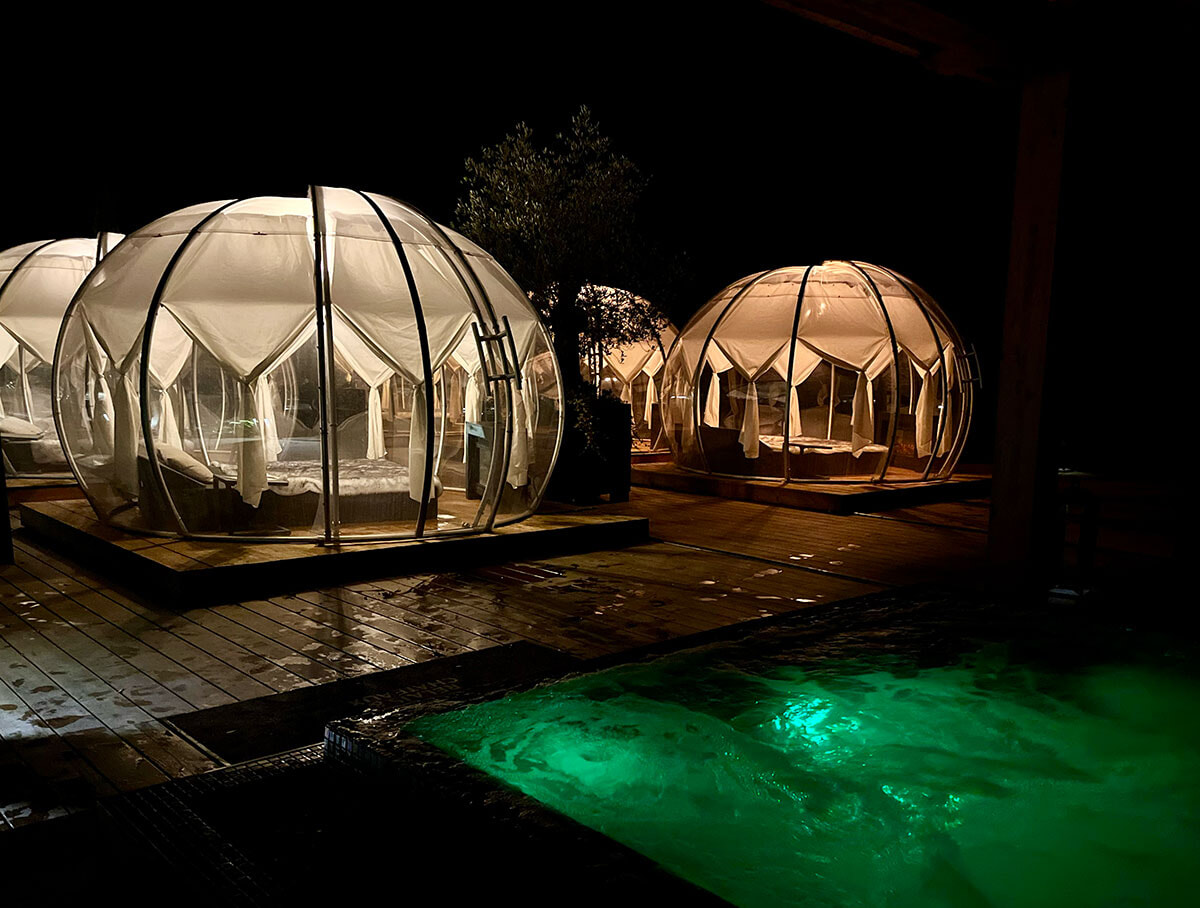 800平米あるスパで楽しめるのは温水プール、ジャクジー、サウナ、ハマム、フィンランド風シャワーなど。ゆったりとしたベッドが多く備えられていて、静かに読書をする人、のんびりとお昼寝をするカップル……。屋外では夏はプールで泳ぎ、ビーチベッドを並べたテラスでくつろいで。秋冬の今は6つの透明なイグルーの中でブランケットにくるまってコクーニング!
