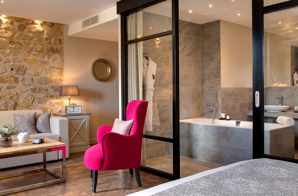 ホテルの客室は全28室。そのうち12室は4タイプのスイートでブリジット、シュザンヌ、フィリップなどいずれもオーナーのファミリーの名前が付けられている。オーナー夫妻のアイデアが生かされた内装は客室ごとに異なるものの、どの部屋も落ち着きと温かみがあり目に快適だ。自然の中に建つホテルである。窓からの広がりある眺めもとても贅沢。