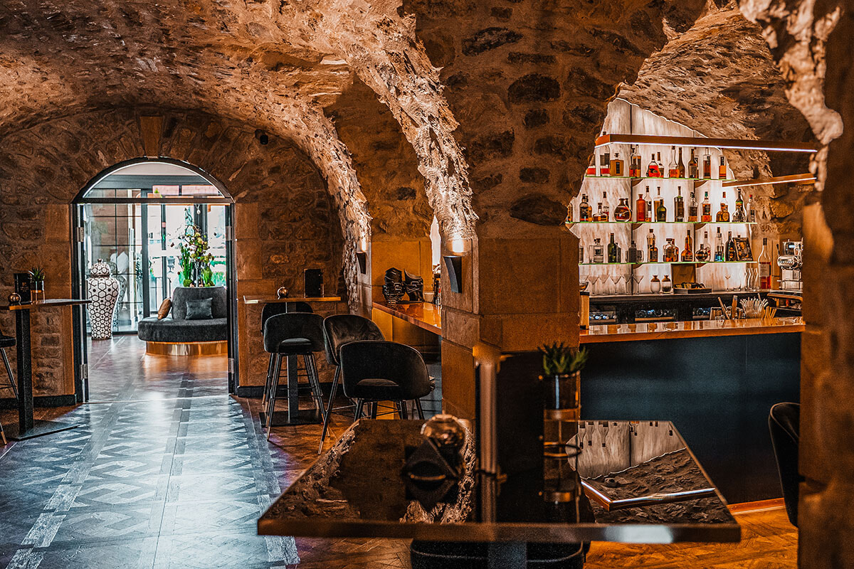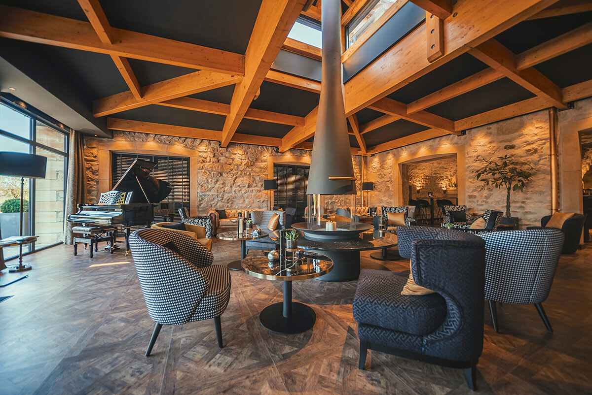 開業以来拡張を続けているル・ドメーヌ・ドゥ・ラ・クラウス。ホテルのしっかりとした石造りの建物は昔からそこにあるといった印象を受ける。2年がかりの建築が始まる前、いまホテルがある場所はオーナーのアレクサンドル・ケッフのファミリーが有する穀物畑だった土地というのが信じがたく、また材料に用いた石は一家の敷地内から採れたものということも驚きだ。”城主”アレクサンドルにとってホテルのゲストは彼の一家のゲストと考え、ホスピタリティを大切にした経営をしている。ホテルの扉を開けて中に入った時から、どこか家族的な雰囲気を感じるのもそれゆえだろう。”世界で最も素晴らしいバー”と評価を得た地上階のバーとそのサロンも、朝から宿泊客以外も迎え入れていて、贅沢感を醸し出しながらもリラックスな空気が流れ、オーナーの”自宅のように寛いで”という声が聞こえてくるようで、それに甘えてのんびりしたくなる場所である。