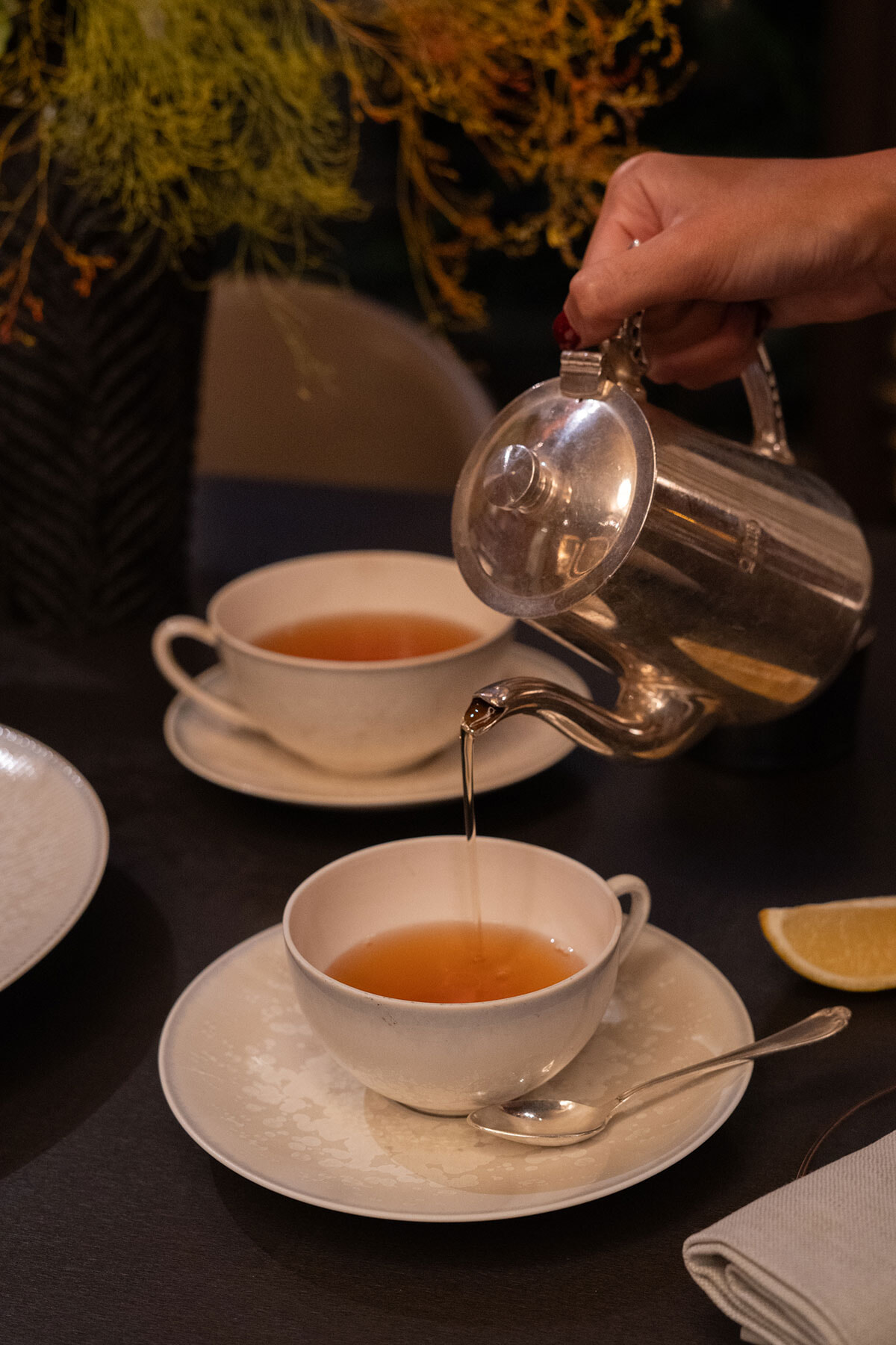 牛肉料理をより豊かな味わいに、と中国茶ベースカクテルにシェフは乾燥キノコをミックス。この次に出るチーズのためには、Petit BéretというブランドのVirgin Muscatにトリュフの抽出液をミックスした飲み物がクリエイトされた。photography: Mathilde Stroh