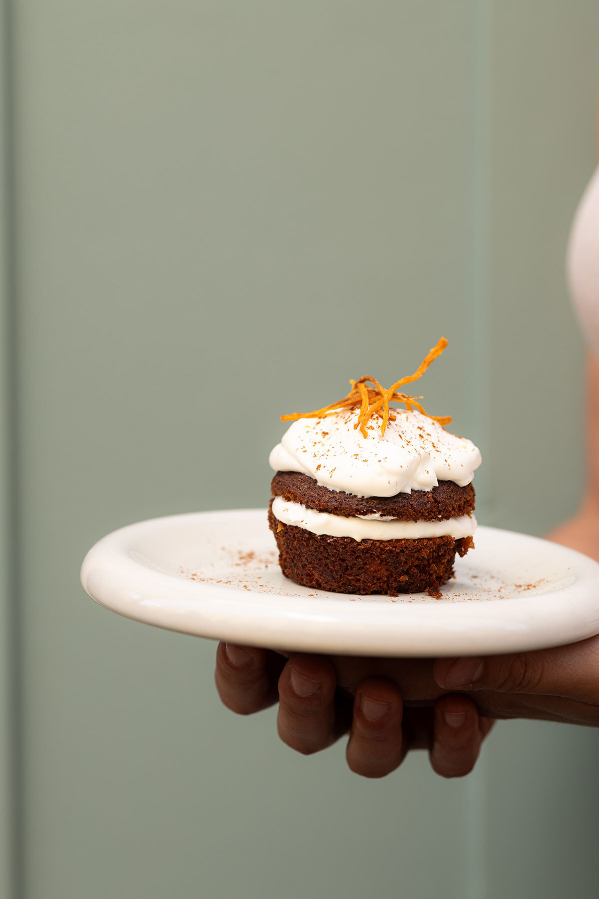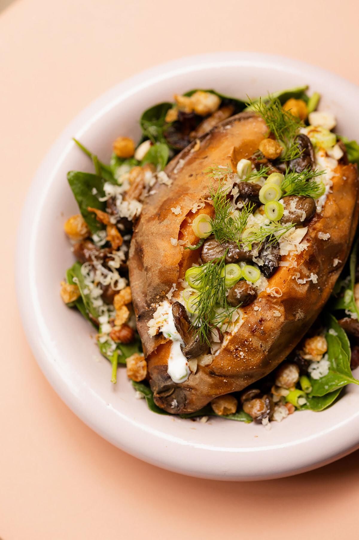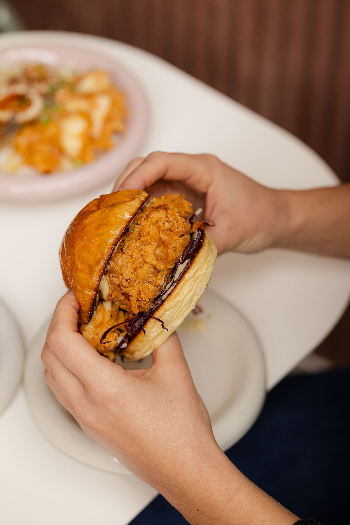 建築事務所のWe Designが内装を手がけたコーヒーショップ的な気軽さを感じさせる店内に、近くで働く人たちがランチタイムに集まってくる。満席ならば、テイクウアウトだ! 夜もイートインとテイクアウトができる。秋にオープンし、すでに常連客が大勢。季節の素材を大切にしているので、バンズが挟む唐揚げやガレットの野菜はブロッコリーやキノコなど季節によって変化する。味付けはマヨネーズやジンジャーなどで、素材変われどおいしさは変わらない。オープン当時にはハルーミのグリルとキムチをポテトバンズに挟んだ味噌マヨソースという個性的なバーガーをシェフは考案。シーザーサラダはハルーミのフライをチキンの代わりに、というようにクリエイションを楽しんで……ベジタリアンと食いしん坊を満足させている。
