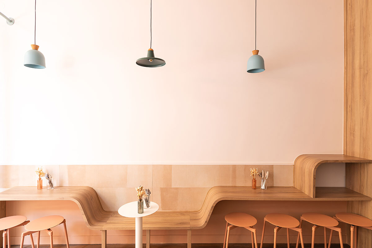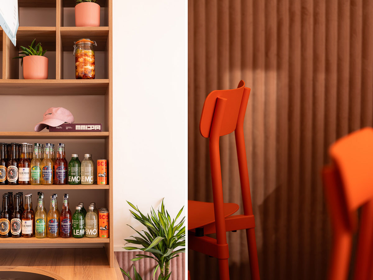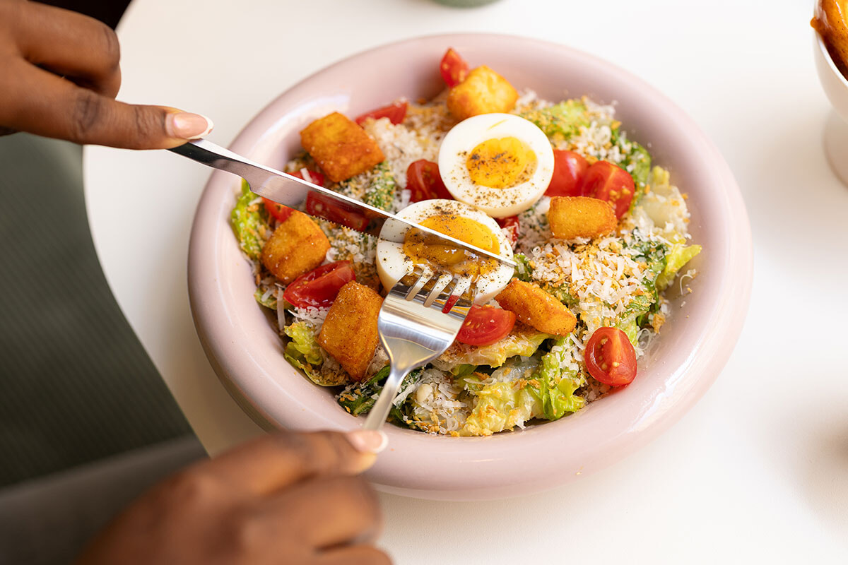 建築事務所のWe Designが内装を手がけたコーヒーショップ的な気軽さを感じさせる店内に、近くで働く人たちがランチタイムに集まってくる。満席ならば、テイクウアウトだ! 夜もイートインとテイクアウトができる。秋にオープンし、すでに常連客が大勢。季節の素材を大切にしているので、バンズが挟む唐揚げやガレットの野菜はブロッコリーやキノコなど季節によって変化する。味付けはマヨネーズやジンジャーなどで、素材変われどおいしさは変わらない。オープン当時にはハルーミのグリルとキムチをポテトバンズに挟んだ味噌マヨソースという個性的なバーガーをシェフは考案。シーザーサラダはハルーミのフライをチキンの代わりに、というようにクリエイションを楽しんで……ベジタリアンと食いしん坊を満足させている。
