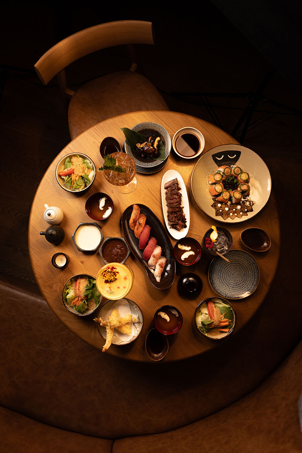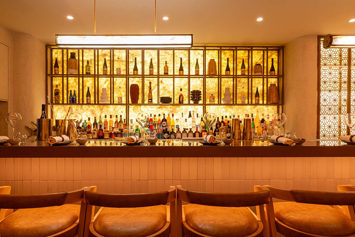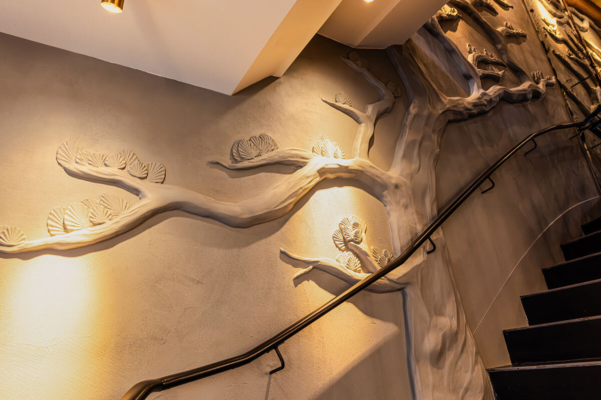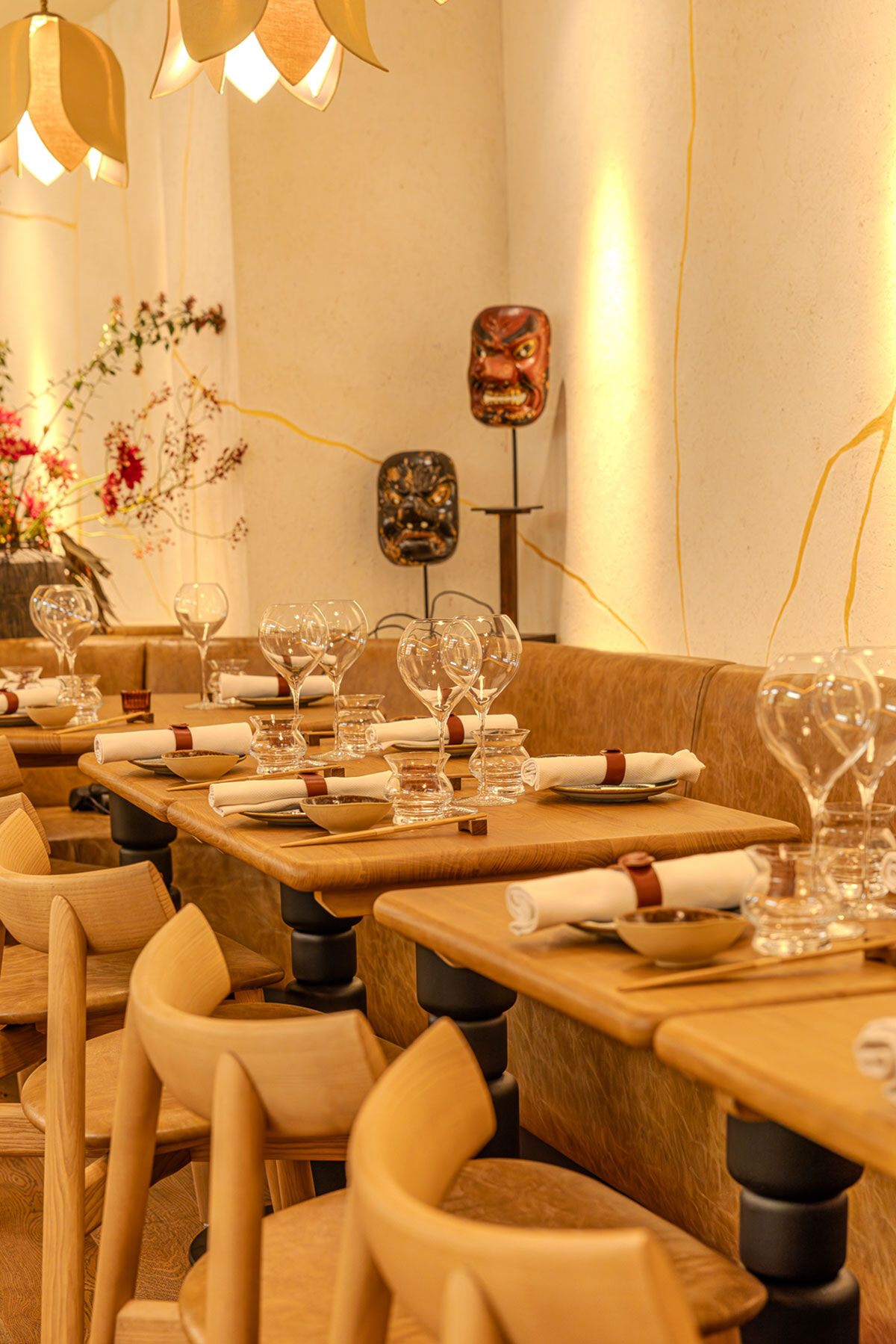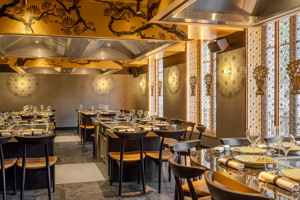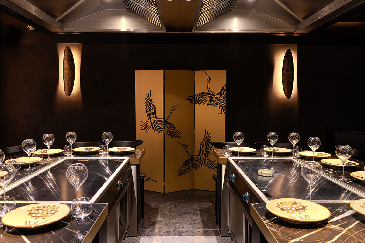 1階が寿司、2階が鉄板焼きのフロアに分かれているパリ店。デザインスタジオLa Villaineが手がけた2階の内装は、鶴や松といった日本の要素を巧みに取り入れながらモダンでソフィスティケートされている。打ち出し真鍮のランプが壁にタンポポの綿毛が浮かぶようなモチーフを生み出していて、なかなかポエティックだ。プライベートサロンでは黒とゴールドの組み合わせが重厚感を醸し出している。甲冑をつけた侍像が置かれているけれど、海外の和食店によくありがちな怪しげな異国情緒が皆無なのがうれしい。これに対して1階はガラリと趣が変わり落ち着いた雰囲気。白壁には金継ぎを思わせるゴールドの模様が描かれ、ずらり並んだチューリップ型のペンダントライトが目に印象的だ。