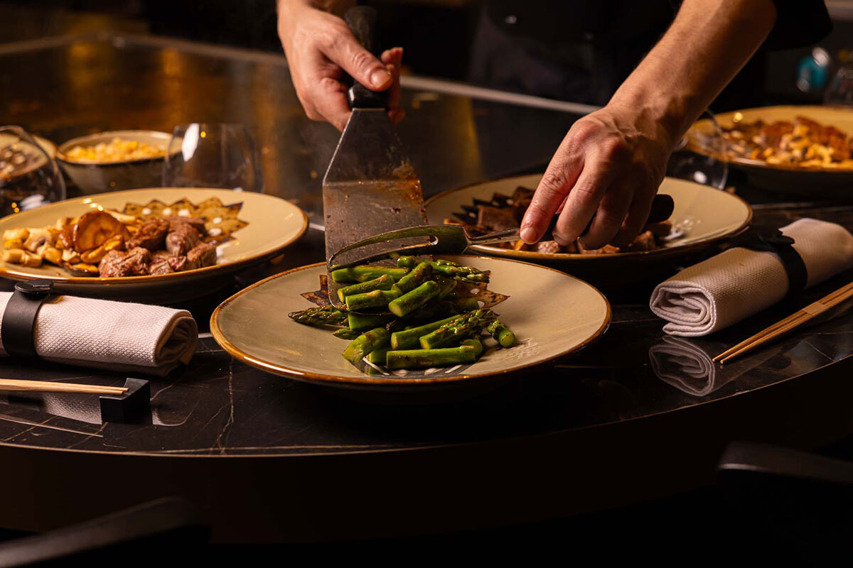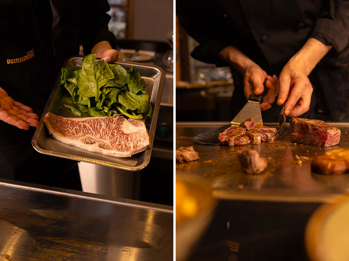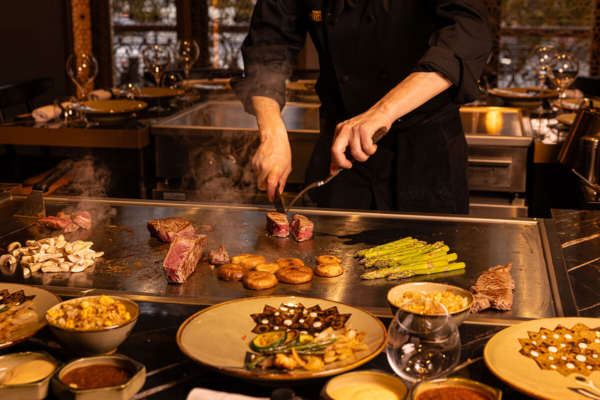 メインとなる鉄板焼きのフロアは、鉄板の調理台を備えたテーブルが複数並んでいる。各テーブルは8人の相席がけで、テーブルごとに料理人がつきパフォーマンス・クッキングを行うのだ。スライスした玉ねぎをタワーのように積み重ね、”エッフェル塔”などと冗談を言いながら、シェフはその中に油を垂らして炎を立ち登らせることからスタート。あちこちのテーブルでそれが行われるので、その度に店内には活気が満ちる。調理人たちは道具を刀よろしく振り回したり、被っているシェフ帽にカットした海老の尻尾を投げ入れたり、フレンドリーに客に向かってジョークを言ったり……。