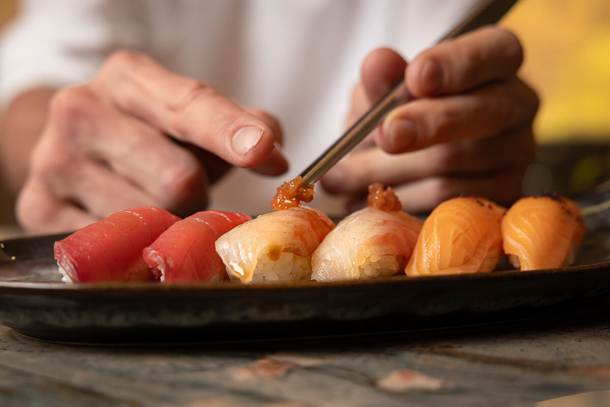 さて、先に書いたようにパリのベニハナの1階は寿司フロアで、片側にテーブル席が並びもう片側は長いバーカウンターという造りだ。2階で鉄板焼きを食べずに、ここでお寿司だけのランチやディナーを取るのもいいだろう。ベニハナ・パリのシェフを務めるのは、ヤニック・アレノの元で働いたダヴィッド・クーロンだ。寿司と刺身にはフランス人になじみの深いサーモン、鯛、赤マグロ、イエローテイル、ホタテ、トロ。これに加えて、巻きものが何種か。