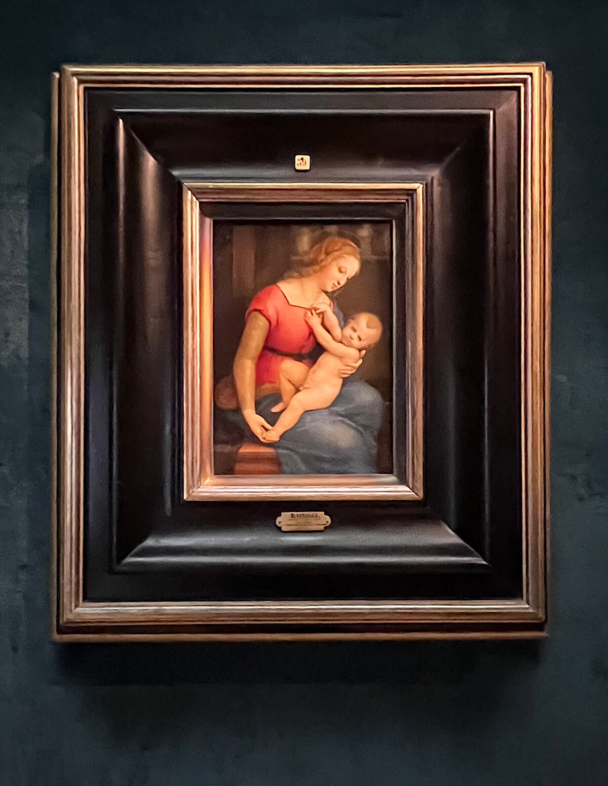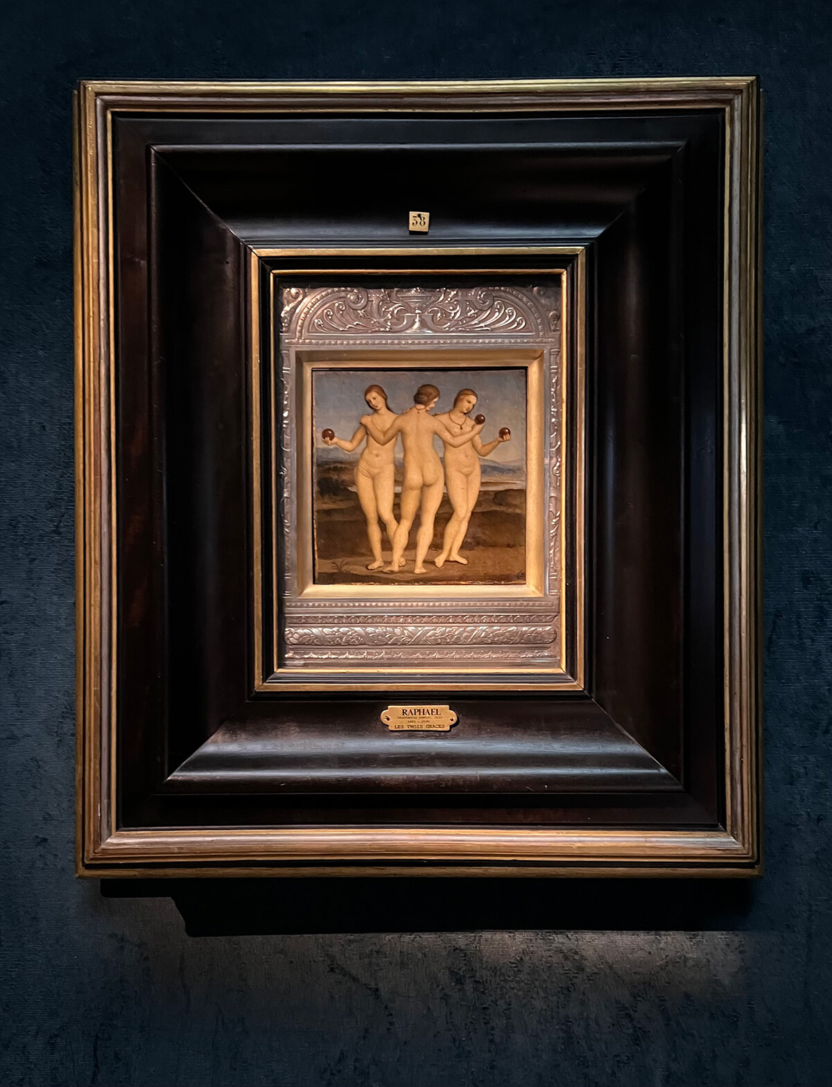 オーマル公は自身のコレクションを収めたシャトー内の一連の部屋をコンデ美術館と呼んでいた。ここまで来て見逃したら惜しいのはラファエロの3点である。その中でもっとも有名なのはサンチュラリオという部屋に展示されている小さな『三美神』だろうか。画家の初期の作品でとても人気者なので、大勢が常に囲むようにして鑑賞している。同じ部屋にはラファエロの『オルレアンの聖母』も。長いこと19世紀に制作された複製と見なされていたのだが、1970年代にオリジナルであることが判明したというエピソードがある作品だ。3点目の『ロレットの聖母』は絵画のギャラリー奥のロトンドで鑑賞できる。オーベルジュ・デュ・ジュ・ドゥ・ポームのガストロノミーレストランのラ・ターブル・デュ・コネターブルの壁にはシャトーが持つ絵画の複製が飾られている。ロトンド入り口の左右の壁に、その2点のオリジナルを絵画のギャラリーで見つけるとちょっとうれしい気分になるだろう。