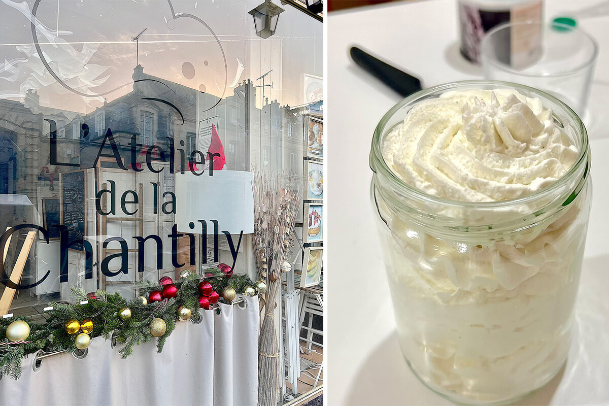 オーベルジュ・デュ・ジュ・ドゥ・ポームを出て、コネターブル通りを町の中心へと向かって右側に進む。パリの街並みと異なり、並ぶ建物が低層なので空の眺めが気持ち良い。商店が並ぶ中、クレーム・シャンティイを専門とするティールームがあり、ウインドーに「L’Atelier de la Chantilly(ラトリエ・ドゥ・ラ・シャンティイ)」と大きく書かれているのが目に入る。1時間で本場のクレーム・シャンティイの作り方を教わる場所だ。使う材料やホイップのテクニックを学び……自分で作ったクレームをボトルに詰めて持ち帰るという1時間のレッスン(33ユーロ~)。思い出作りに試してみる?
