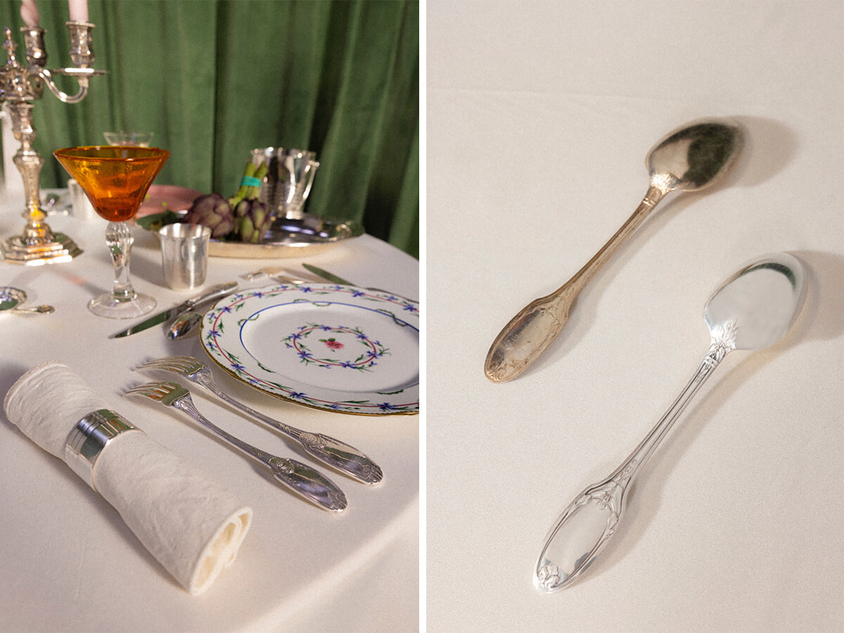 メゾンの品を愛する人々が所有する過去の品からヴィンテージコレクションに選ばれるのは、現在生産されていないデザインに限られている。熟練のサヴォワールフェールを誇るアトリエが修復を施すことで、職人の手に託された品々は歴史を保ちつつも見事な輝きを取り戻すのだ。どんなクリストフルの名品がこのヴィンテージコレクションに見つけられるだろうか。いまでは入手不可能の、たとえばアールヌーヴォー期の典型的なコレクション「Delafosse」だったり、ノルマンディー号のような豪華客船で用いられたコレクション「Atlas」だったり……。アイテムはナイフレスト、シャンパンバケツ、エッグスタンド。何に出合えるかは、ほぼ一点ものゆえタイミングに掛かっている。運が良ければ、装飾美術館の展覧会で展示されている野菜の花器のひとつ”トウモロコシ”も! 販売はパリのロワイヤル通り本店、サントノーレ店、そしてクリストフルのオフィシャルサイトにて(オンラインでの販売はヨーロッパ圏内のみ対応)。どの品もヴィンテージコレクション用の特製グリーンボックスに納められて販売される。