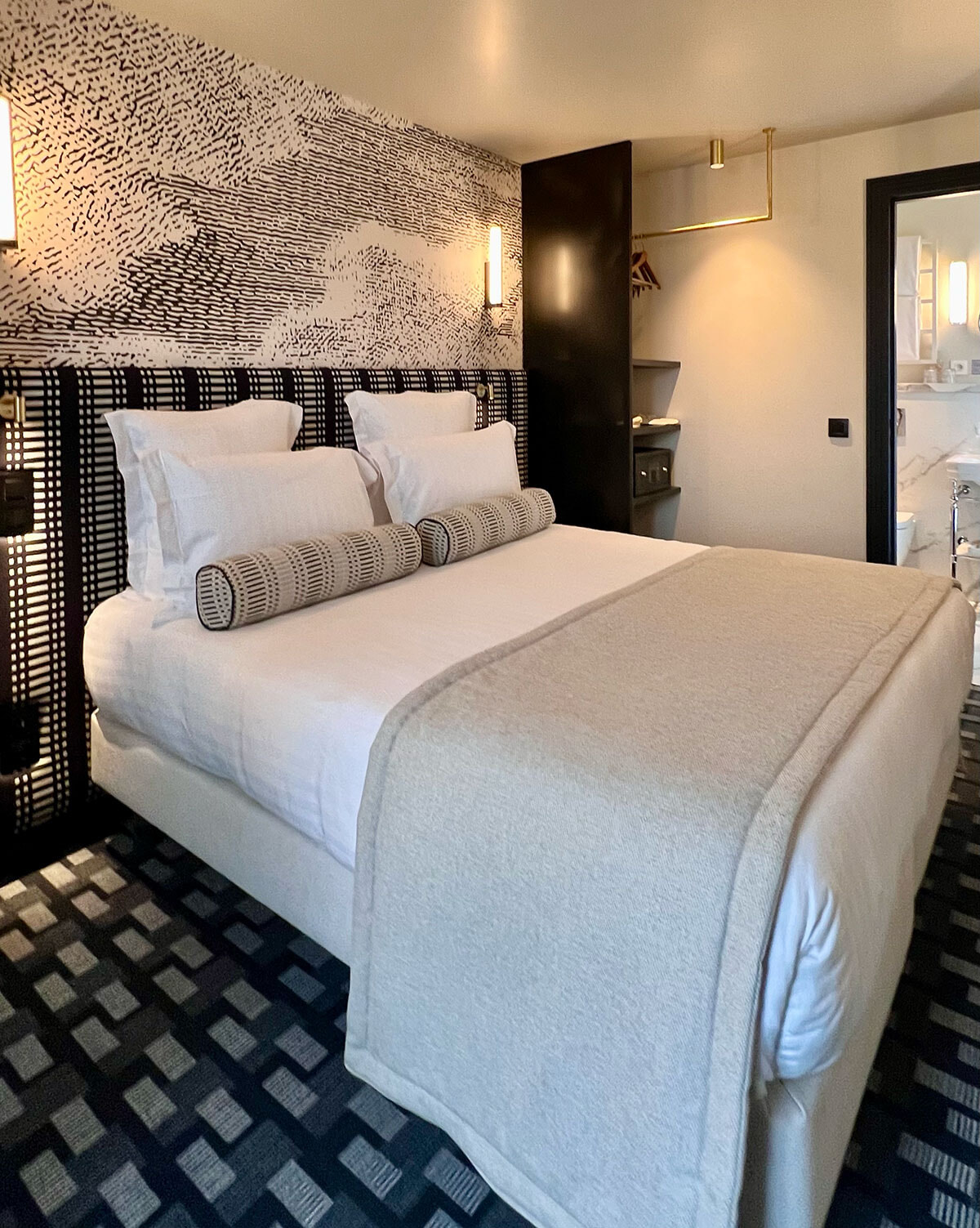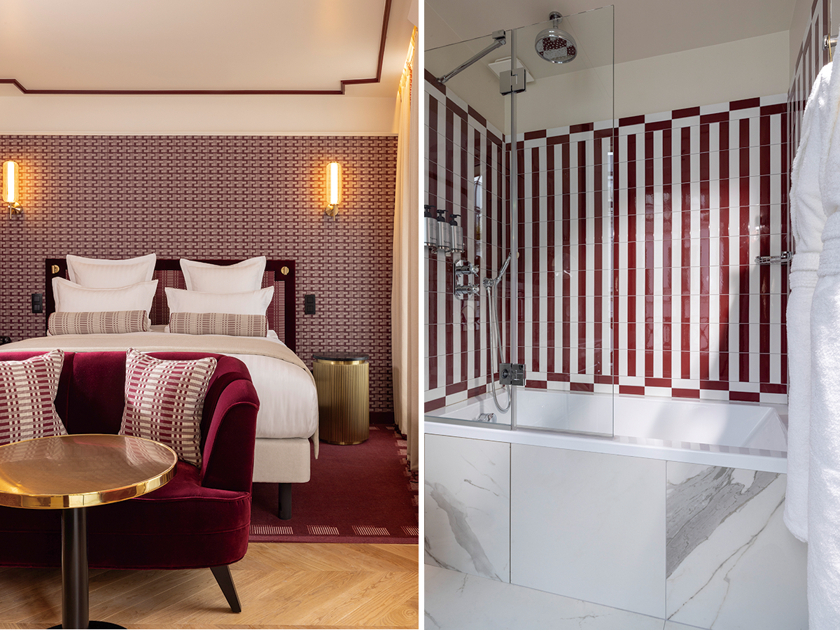 パブリックスペースも客室もコンテンポラリーなインテリアはシックでエレガント。贅沢ながらこれ見よがしな感じがなく、さりげなさが目に気持ちよい。手がけたのはアンヌ・クレール・マジョレル(Studio Majorel)とソニアン・ルマニャン(Agence Vertical)で、おもてなしの心も感じられる空間をつくりあげたのだ。部屋のキーカラーは5色あり、これらは世界の紙幣で使われている色だそうだ。ブルー、グリーン、ブラック&ホワイト、赤そしてオークルめいた錆色の5色である。部屋の基調となる色のラインが印象的なグラフィックが壁布やクッションなどに生かされ、部屋全体を染め上げているようだ。