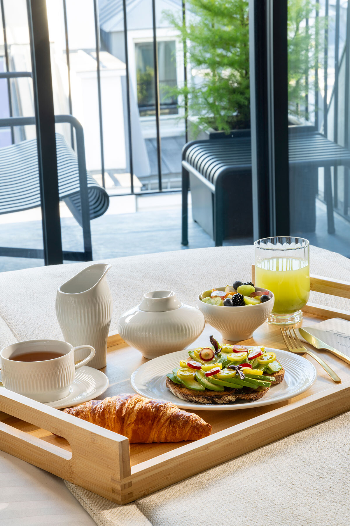 客室はクラシック、ドゥリュクス、テラス付きドゥリュクス、テラス付きジュニアースイート、スーペリアの5タイプ。バスタブを備えた部屋もあり、またアメニティはパリ生まれのスキンケアブランドTypology.(ティポロジー)を使用している。ホテルにレストランはなく、ルームサービスは外部のレストランと直結。12時から24時までオーダーが可能で、注文から30分で配達されるという。いかにも都会のプティ・ホテルである。次のパリ旅行、フィリグランヌに泊まってみては?